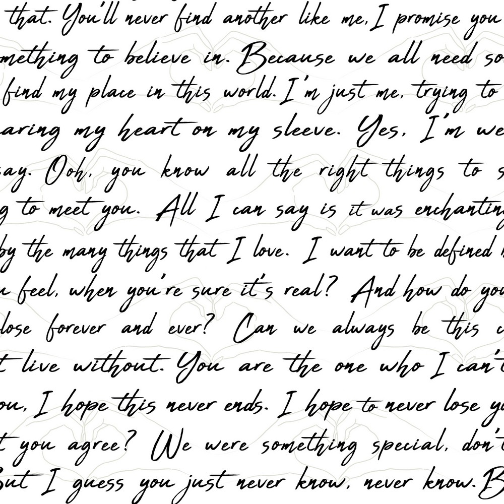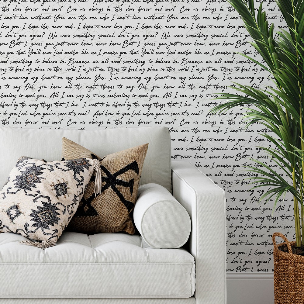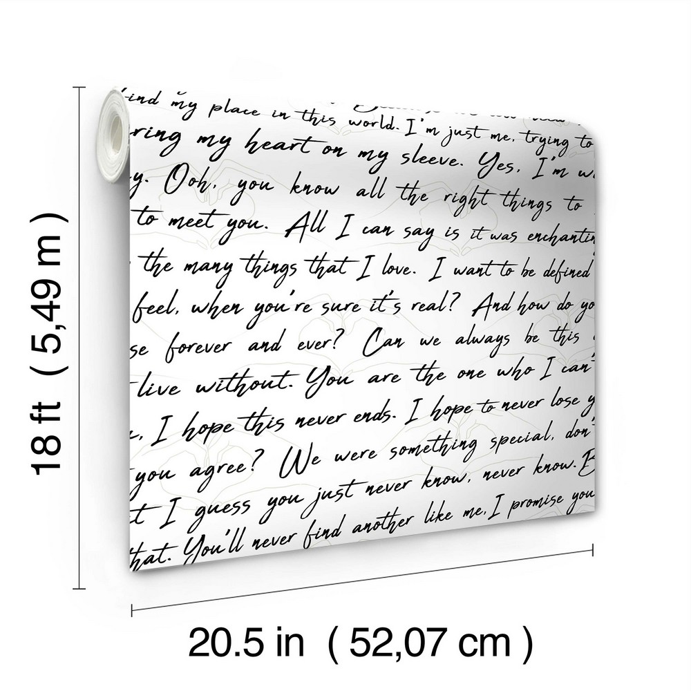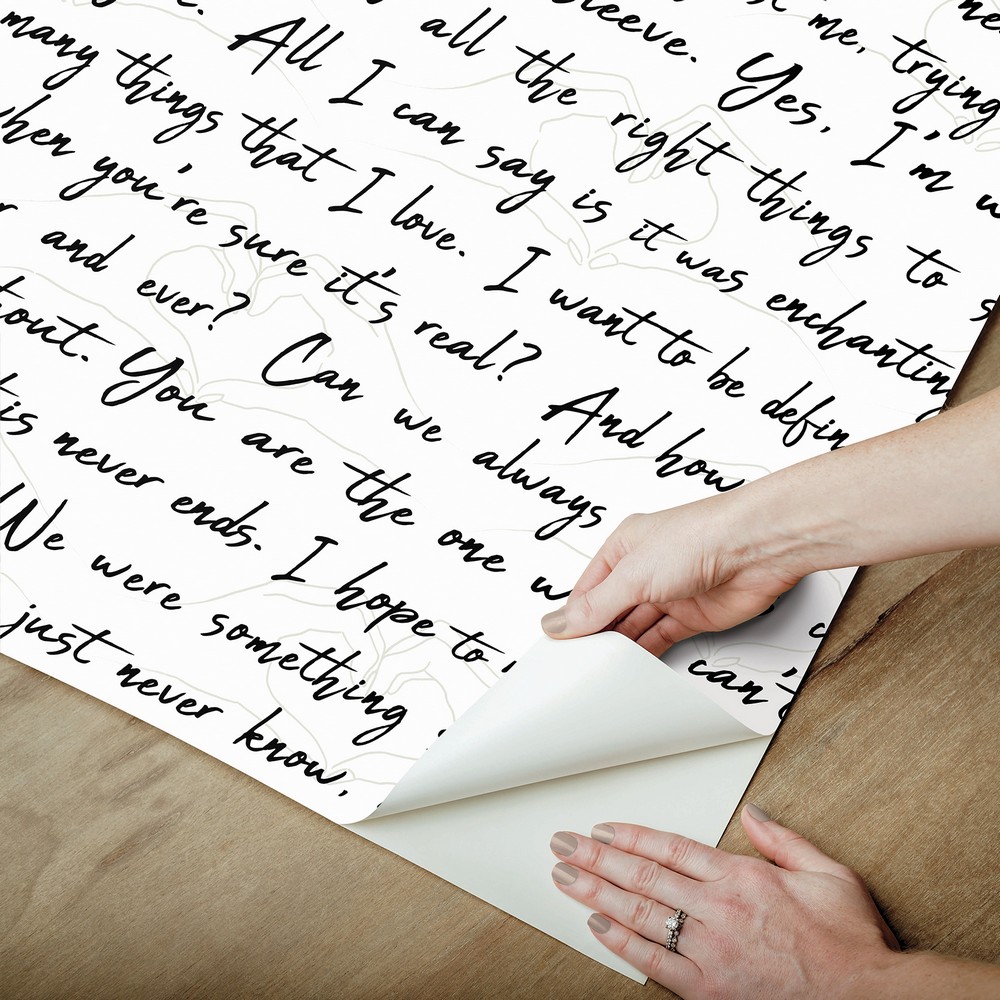 | Hold up your hand hearts and swoon for this romance-filled peel and stick wallpaper print. Featuring hand-written notions reminiscent of romantic ballads and love stories, this black and white print is perfect for those who wear their hearts on their sleeve. Love Letters Ink Peel and Stick Wallpaper comes on one roll that measures 20.5 inches wide by 18 feet long. RoomMates Peel & Stick Color Family: Whites & Off-Whites current Alphabet & Numbers Effect: |