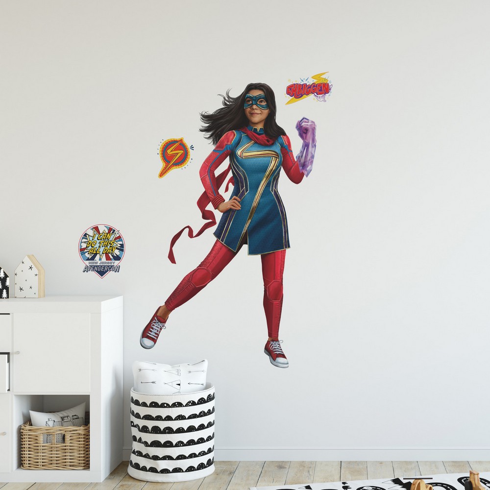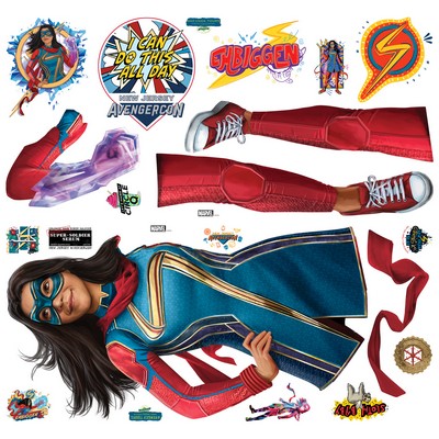 | Calling all Ms Marvel fans! Bring a giant Ms Marvel to your walls with a Ms Marvel Giant Wall Decal set. Make the scene come to life and move each decal around as you need. The revolutionary adhesive backing will not ruin your paint or dry wall. RoomMates Color Family: Blues Whimsical Licensed Effect: |