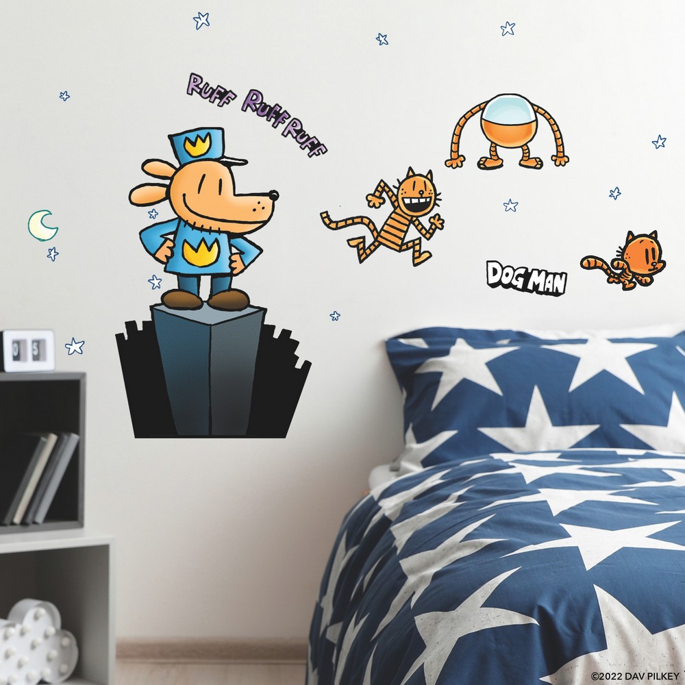 Show your appreciation for the crime-biting hero you love: Dog Man! This officially-licensed peel and stick wall decal set features Dav Pilkey's Dog Man along with Petey, Little Petey, and other imagery from the series. Installation is as simple as Peel, Stick, Done!™