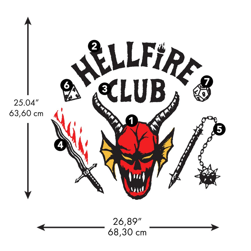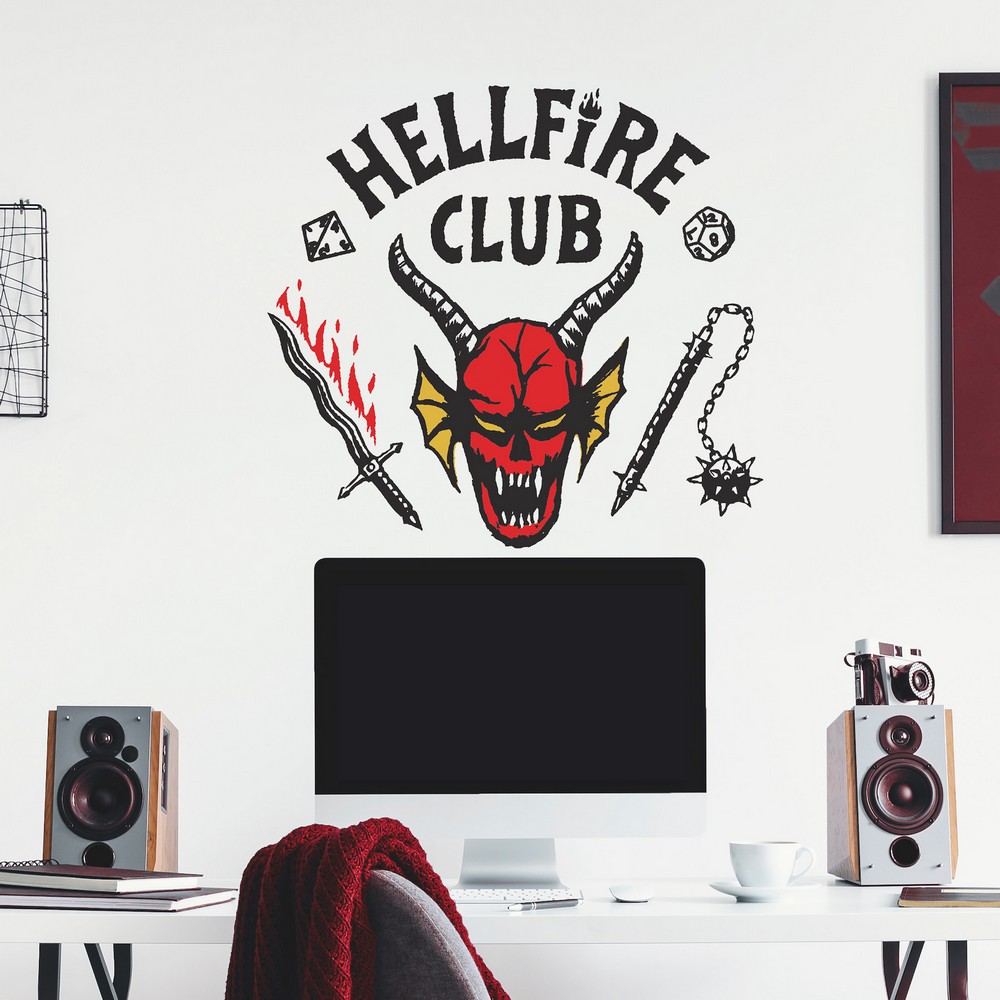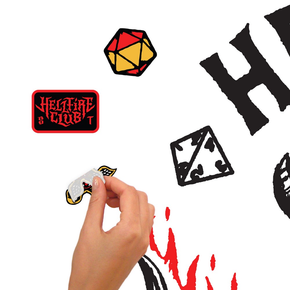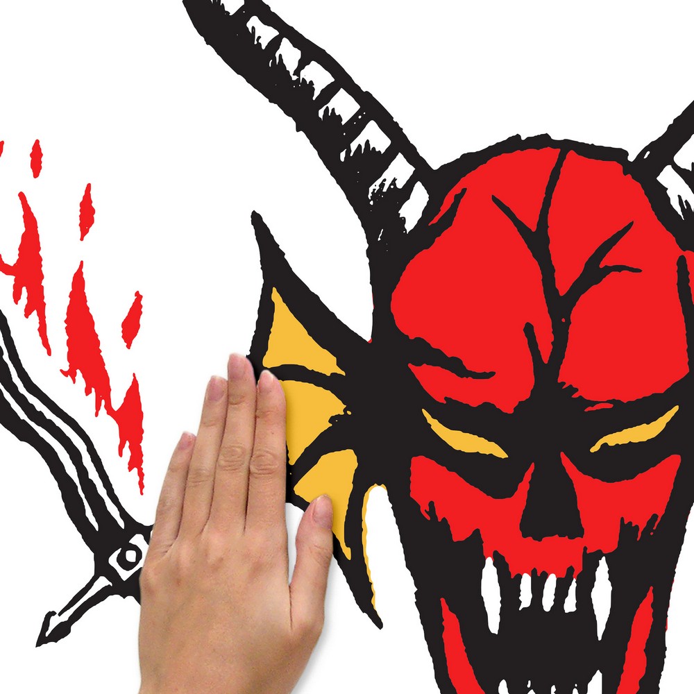 | Stranger Things fans, this one's for you. Officially-licensed Netflix giant peel and stick wall decals highlight one of the most iconic images from the hit series Stranger Things: the Hellfire Club! This set of renter-friendly decals features the imagery from Eddie's shirt, with the horned figure, dice, and more. Installation is as simple as peel, stick, done! RoomMates Color Family: Reds Whimsical Licensed Effect: |