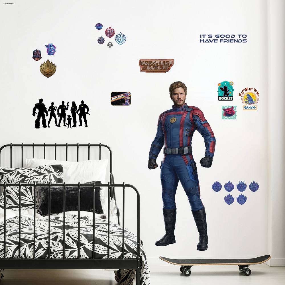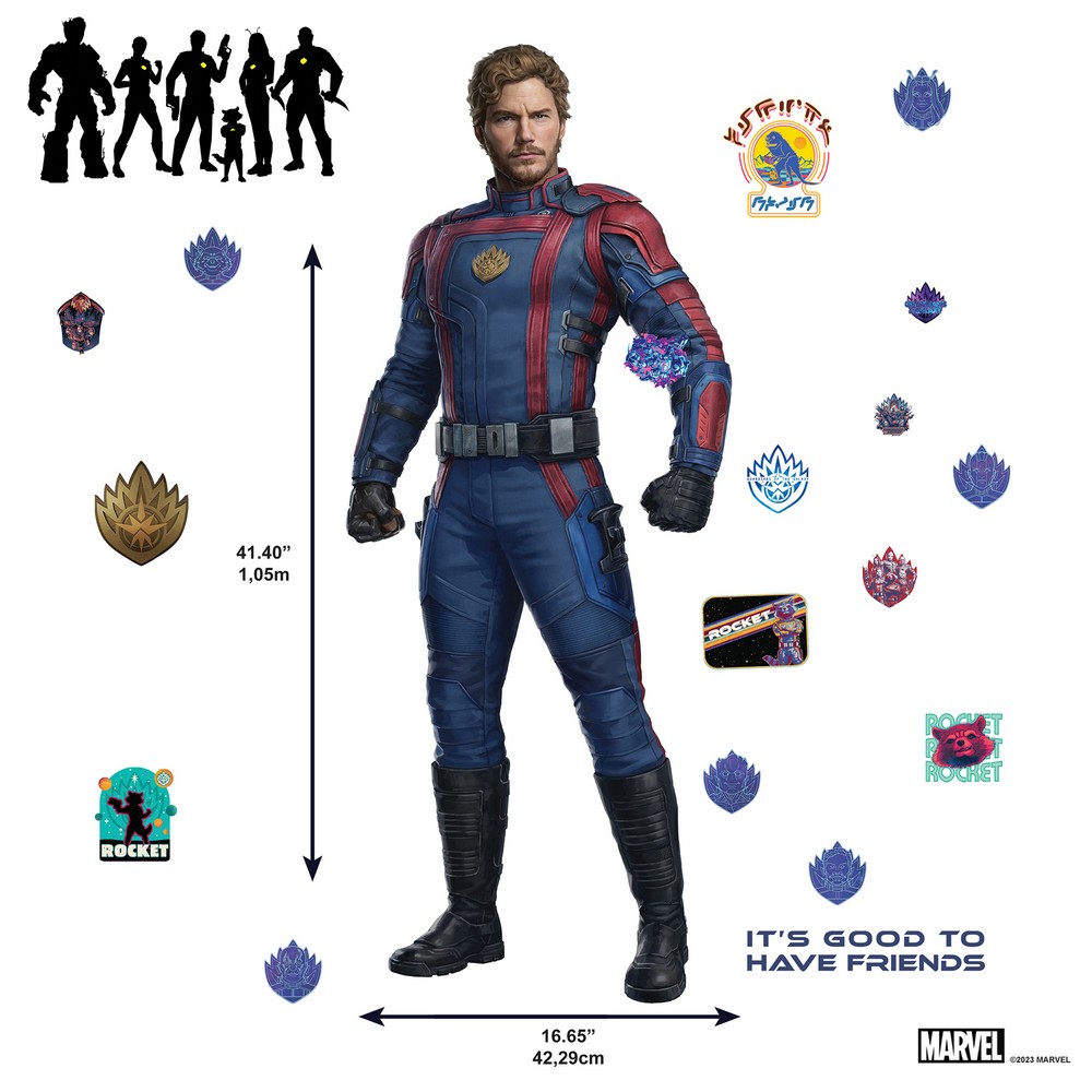 | Celebrate your favorite Galactic Guardian with this officially licensed Marvel Studios’ Guardians of the Galaxy: Vol. 3 Peter “Star-Lord” Quill peel and stick giant wall decal set! Featuring Star-Lord, his most memorable iconography and other images from the hit film, this set of peel and stick decals helps you easily display your favorite character. Installation is as simple as Peel, Stick, Done!™ RoomMates Color Family: Multicolor current Graphics Effect: |