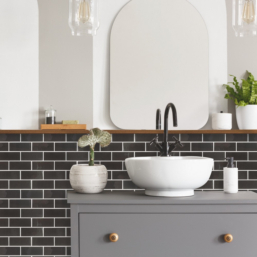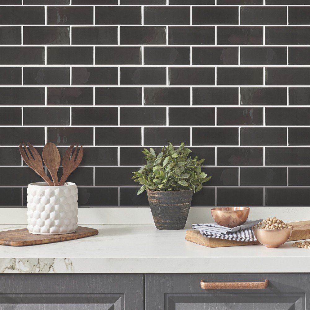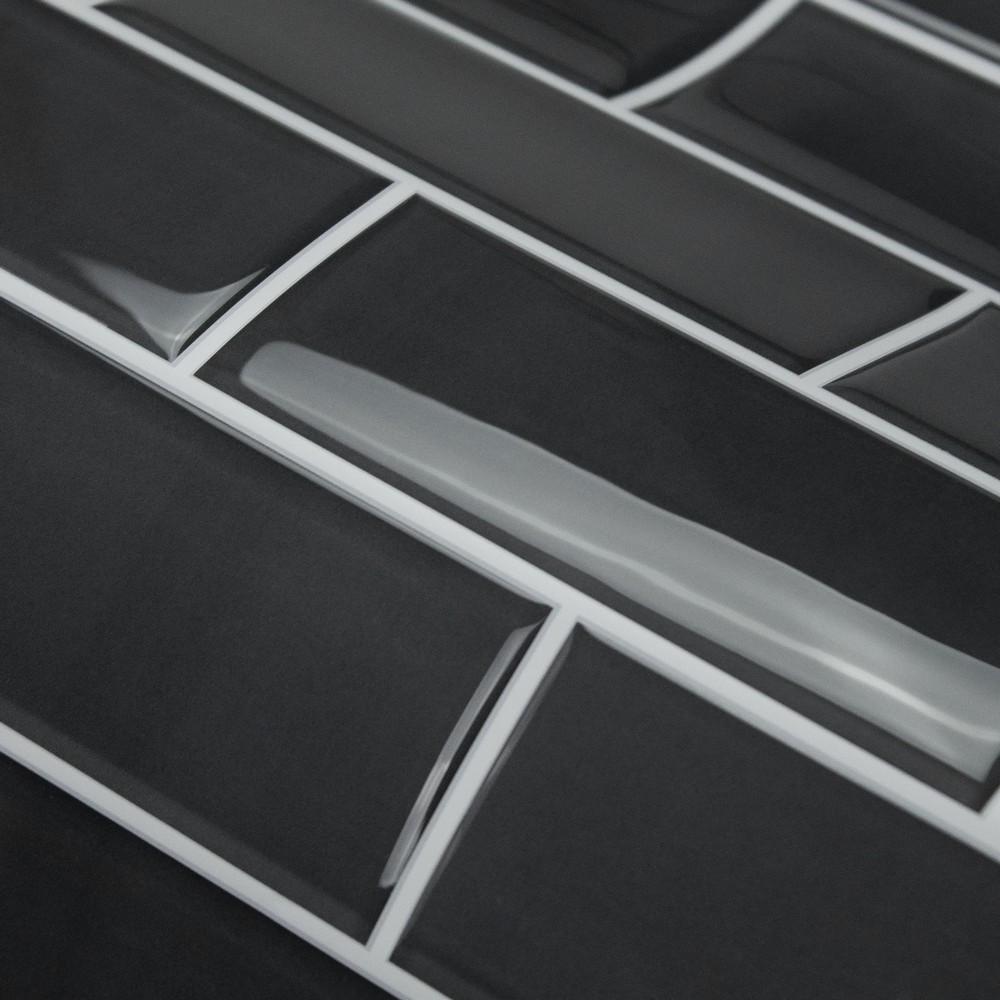| make the look of real subway tile with this peel and stick backsplash! Made to look and feel like the real thing, this budget-friendly solution will upgrade your countertop room in as little as peel, stick, done! RoomMates Color Family: Blacks Industrial Graphics Effect: |