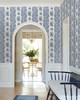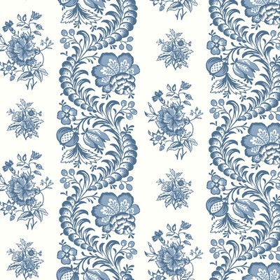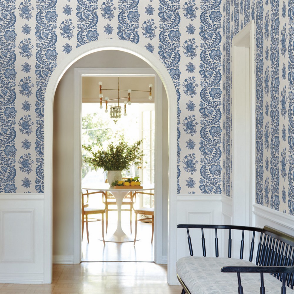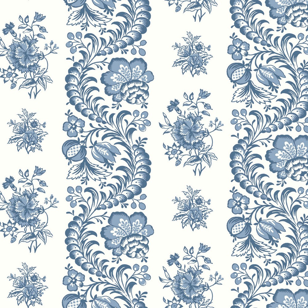 | Antonina Vella Antonina Vella Jardin | Beaumont Blue Floral Stripe Wallpaper Match: Straight Page: 15 Repeat: 25.3 Washable Roll is 27 Inches in width and 27 Feet in Length With About 60.8 square feet Coverage Unpasted Strippable Paste the Wall Colors: Blues Kitchen & Bath Flowers Botanical |