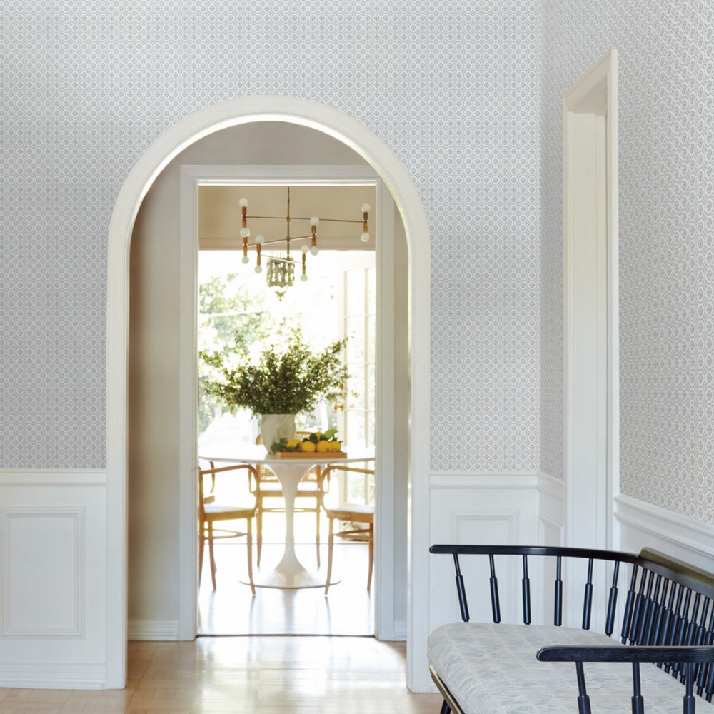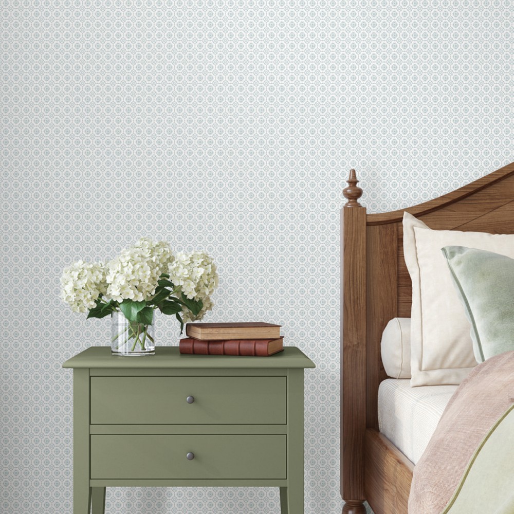 | Antonina Vella Antonina Vella Jardin | Priti Light Blue Floral Grid Wallpaper Match: Straight Page: 7 Repeat: 20.5 Washable Roll is 27 Inches in width and 27 Feet in Length With About 60.8 square feet Coverage Unpasted Strippable Paste the Wall Colors: Blues Farmhouse Flowers Botanical |