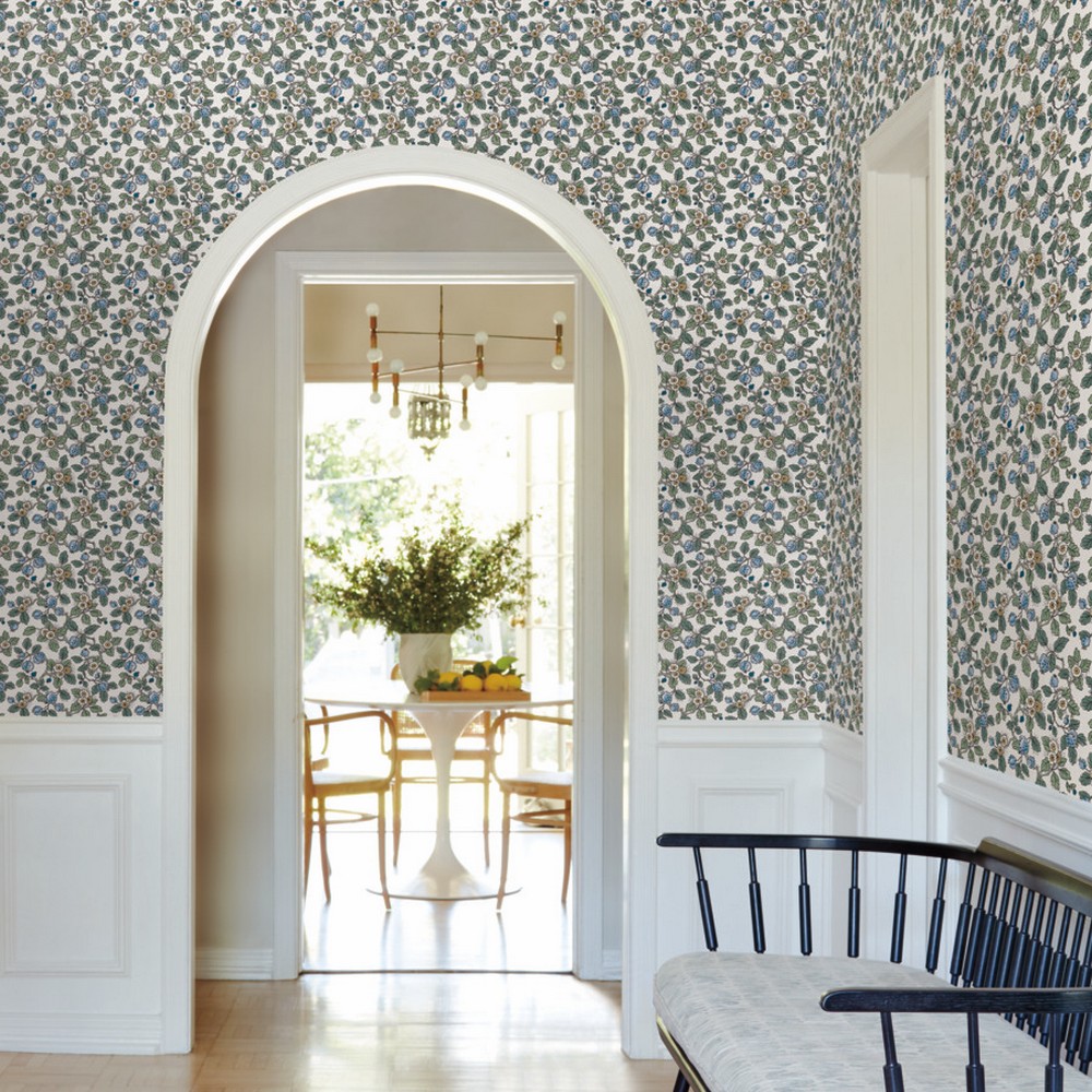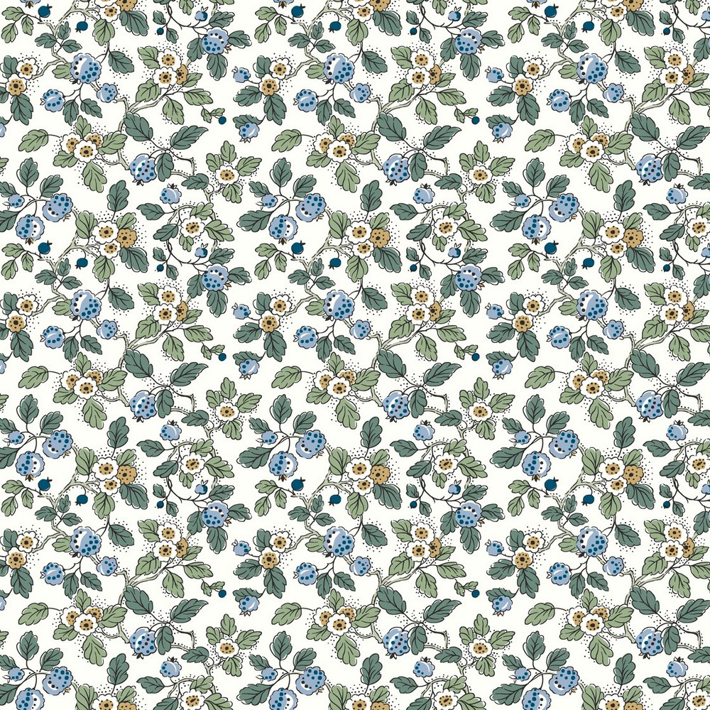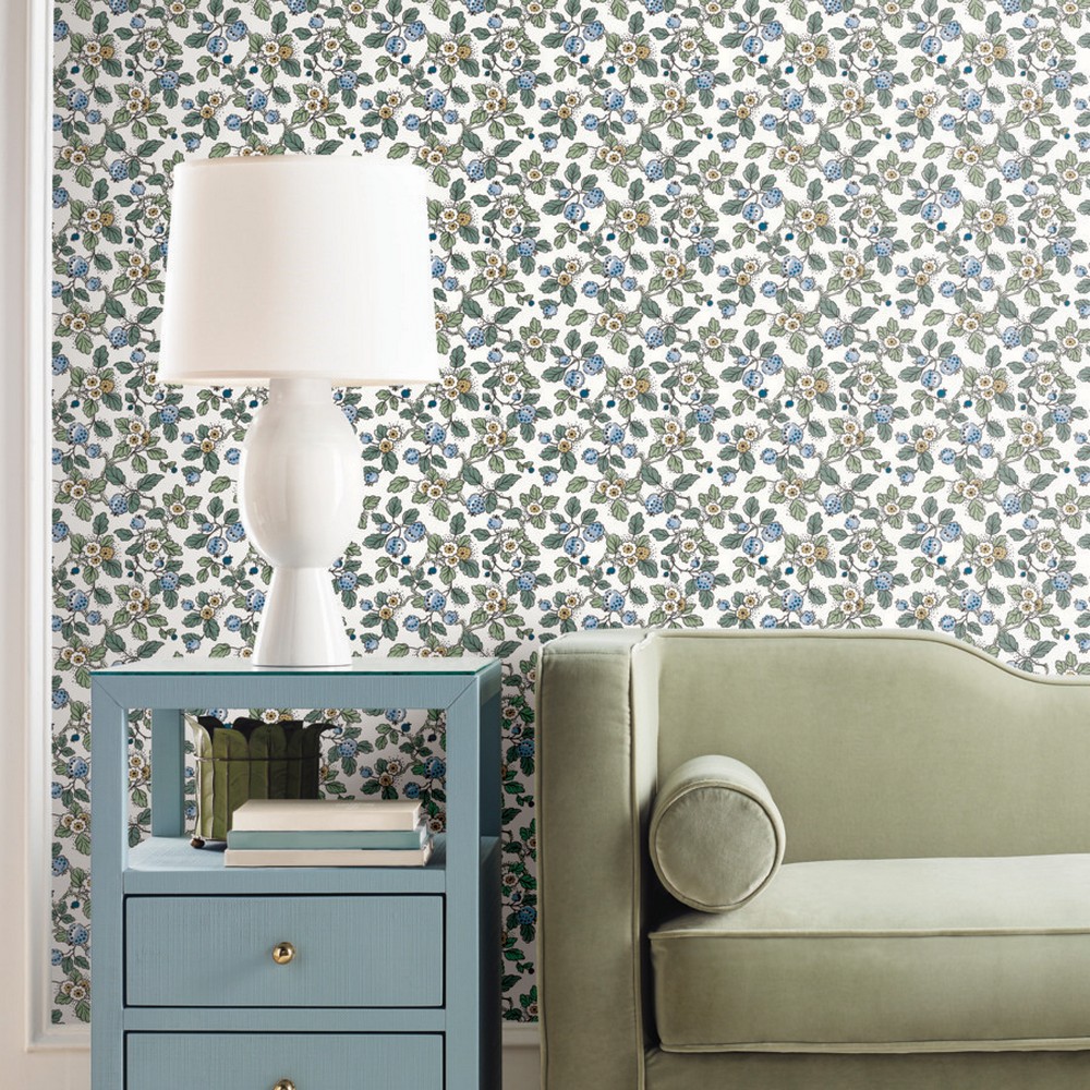 | Antonina Vella Antonina Vella Jardin | Framboise Blue Berry Vines Wallpaper Match: Straight Page: 62 Repeat: 25.3 Washable Roll is 27 Inches in width and 27 Feet in Length With About 60.8 square feet Coverage Unpasted Strippable Paste the Wall Colors: Blues Whimsical Botanical Botanical |