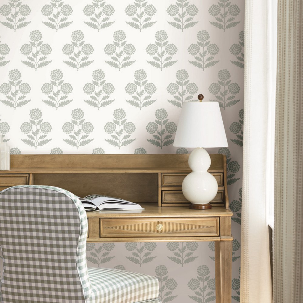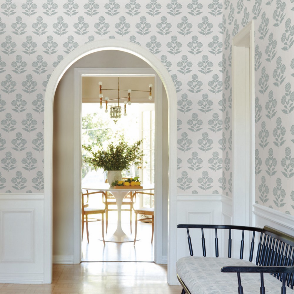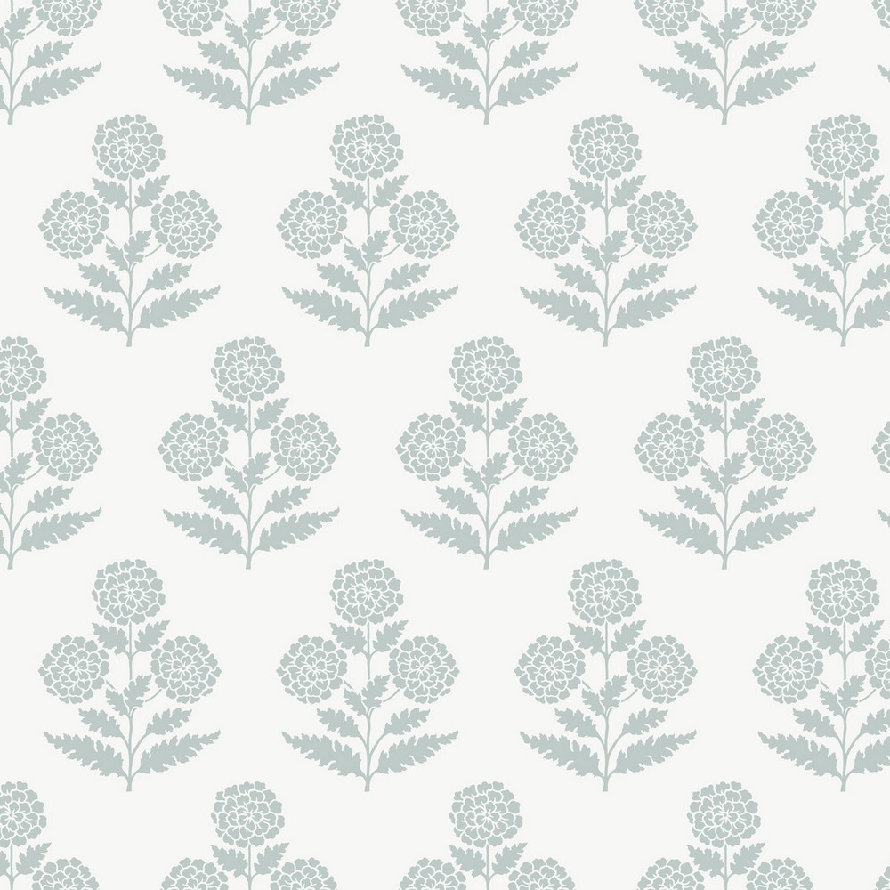 | Antonina Vella Antonina Vella Jardin | Souci Light Blue Marigolds Wallpaper Match: Straight Page: 68 Repeat: 25.3 Washable Roll is 27 Inches in width and 27 Feet in Length With About 60.8 square feet Coverage Unpasted Strippable Paste the Wall Colors: Blues Modern Flowers Botanical |