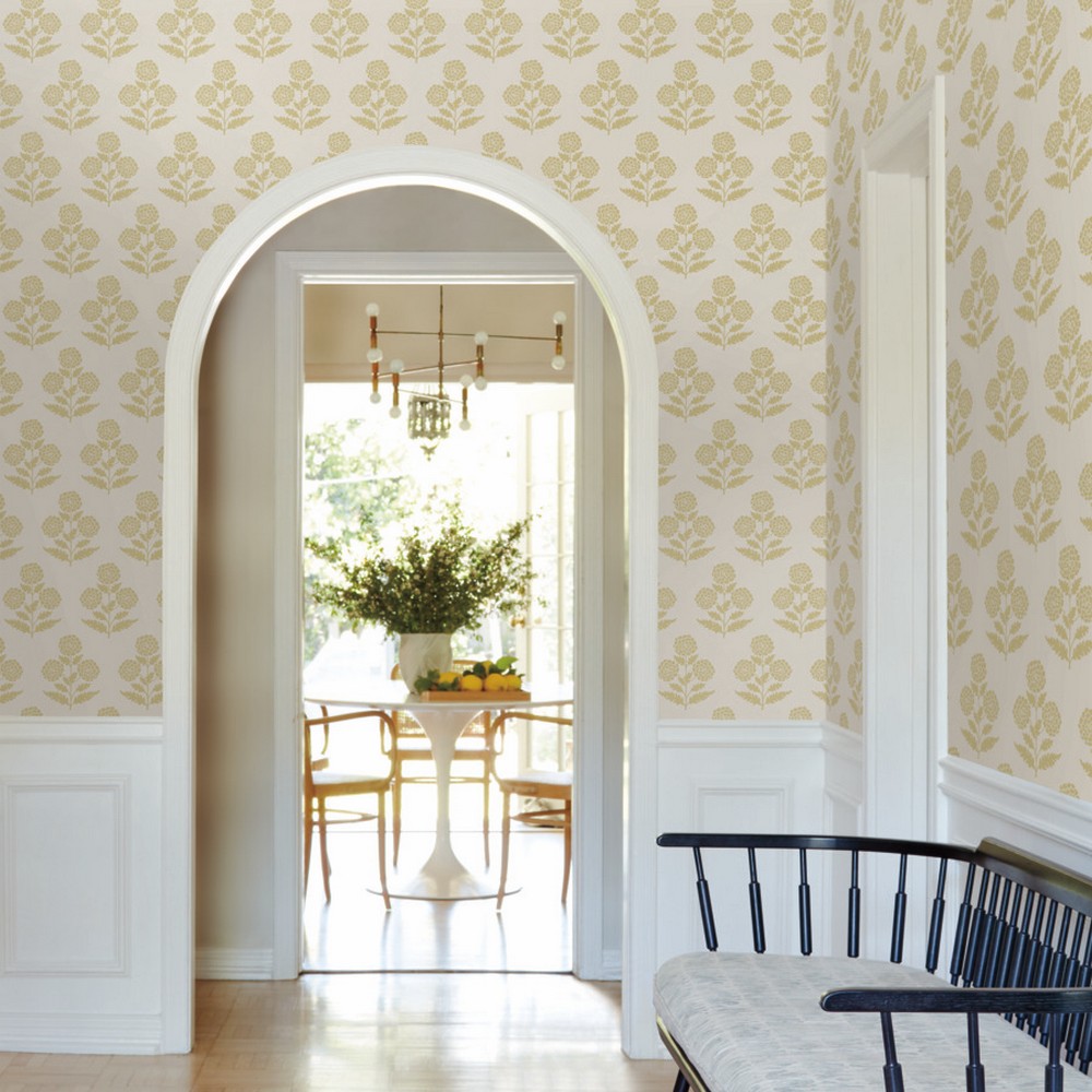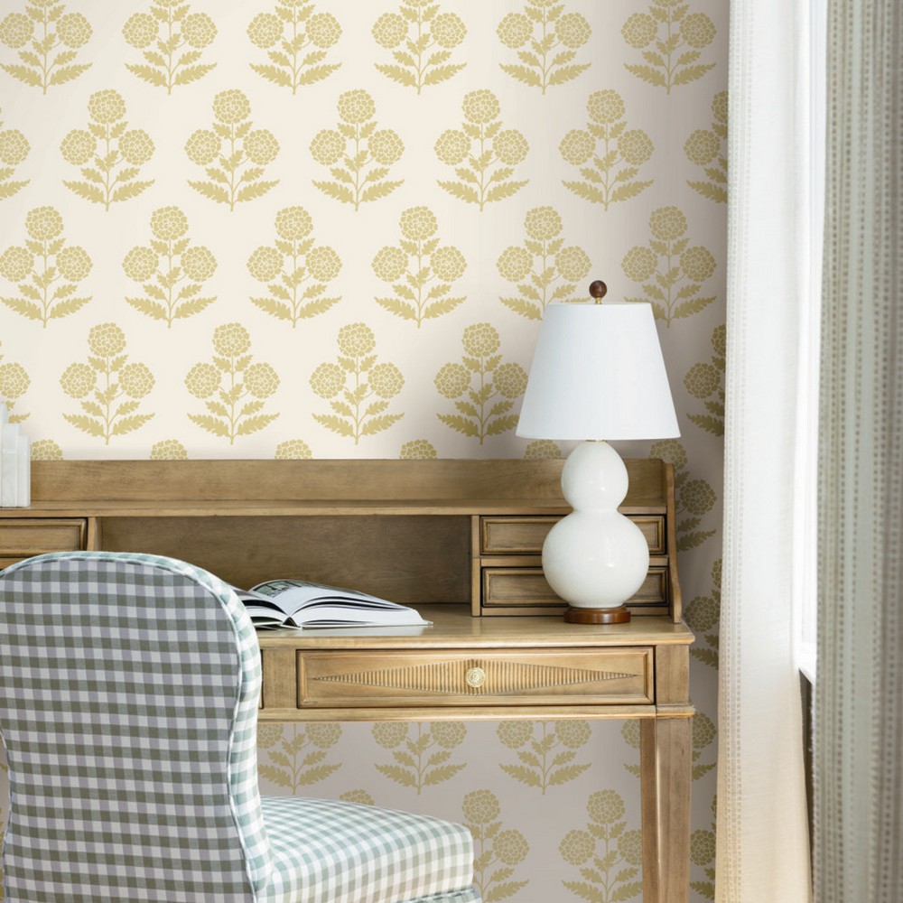 | Antonina Vella Antonina Vella Jardin | Souci Butter Marigolds Wallpaper Match: Straight Page: 67 Repeat: 25.3 Washable Roll is 27 Inches in width and 27 Feet in Length With About 60.8 square feet Coverage Unpasted Strippable Paste the Wall Colors: Yellows Modern Flowers Botanical |