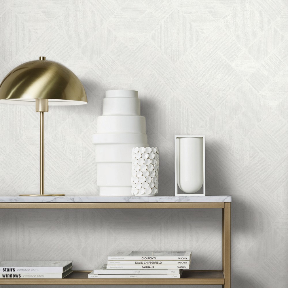 | Antonina Vella Antonina Vella Opulent Accents | Marquetry White Tile Wallpaper Match: Straight Page: 59 Repeat: 25.2 Scrubbable Roll is 20.9 Inches in width and 33 Feet in Length With About 57.5 square feet Coverage Unpasted Strippable Paste the Wall Colors: Whites & Off-Whites Traditional Geometrics Graphics |