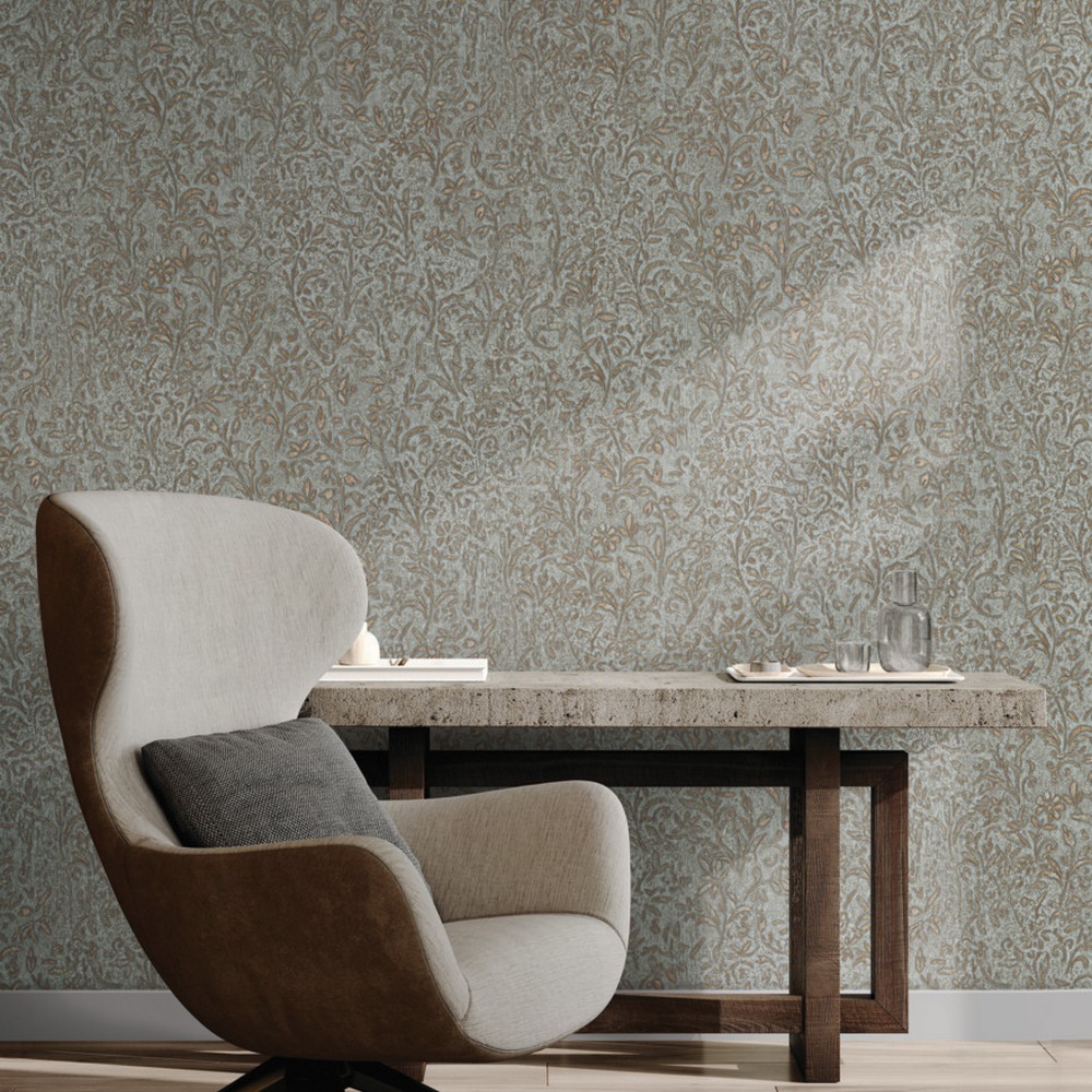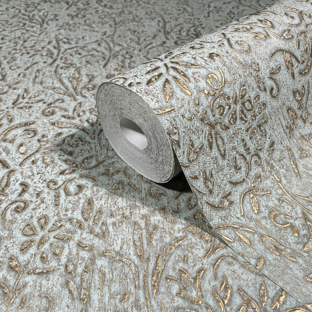 | Antonina Vella Antonina Vella Opulent Accents | Sculpted Floral Gold Relief Wallpaper Match: Drop Page: 54 Repeat: 25.2 Scrubbable Roll is 20.9 Inches in width and 33 Feet in Length With About 57.5 square feet Coverage Unpasted Strippable Paste the Wall Colors: Blues Traditional Flowers Botanical |
