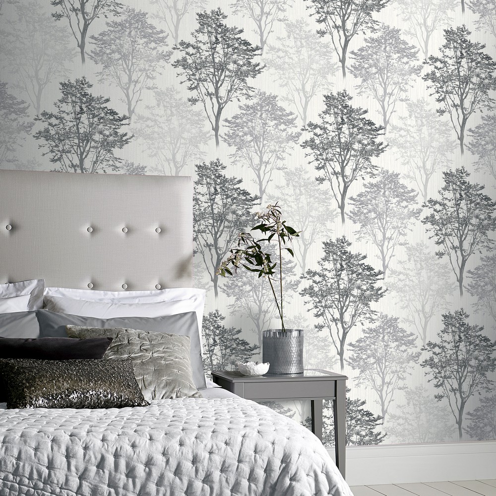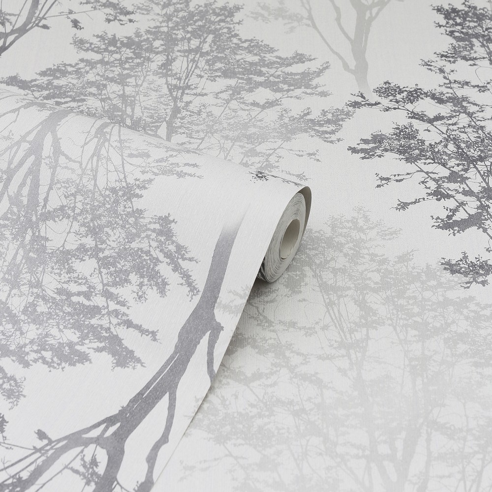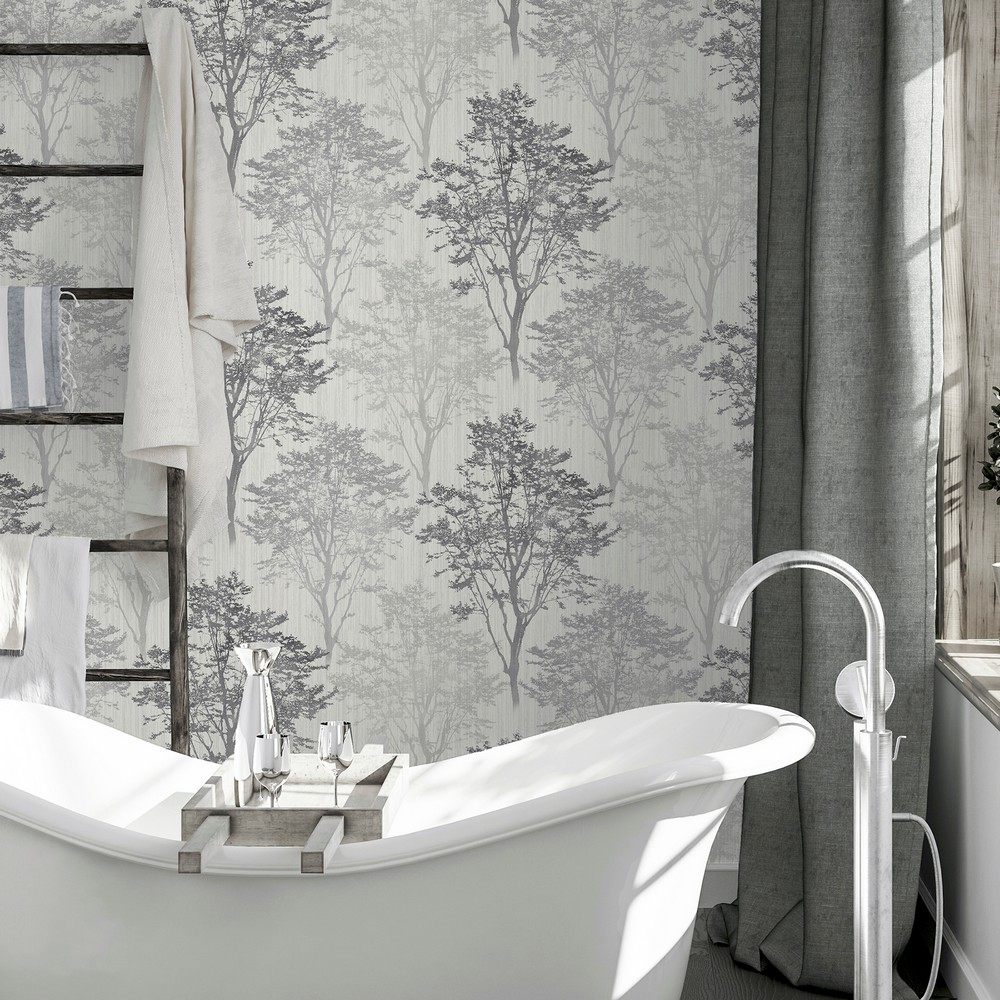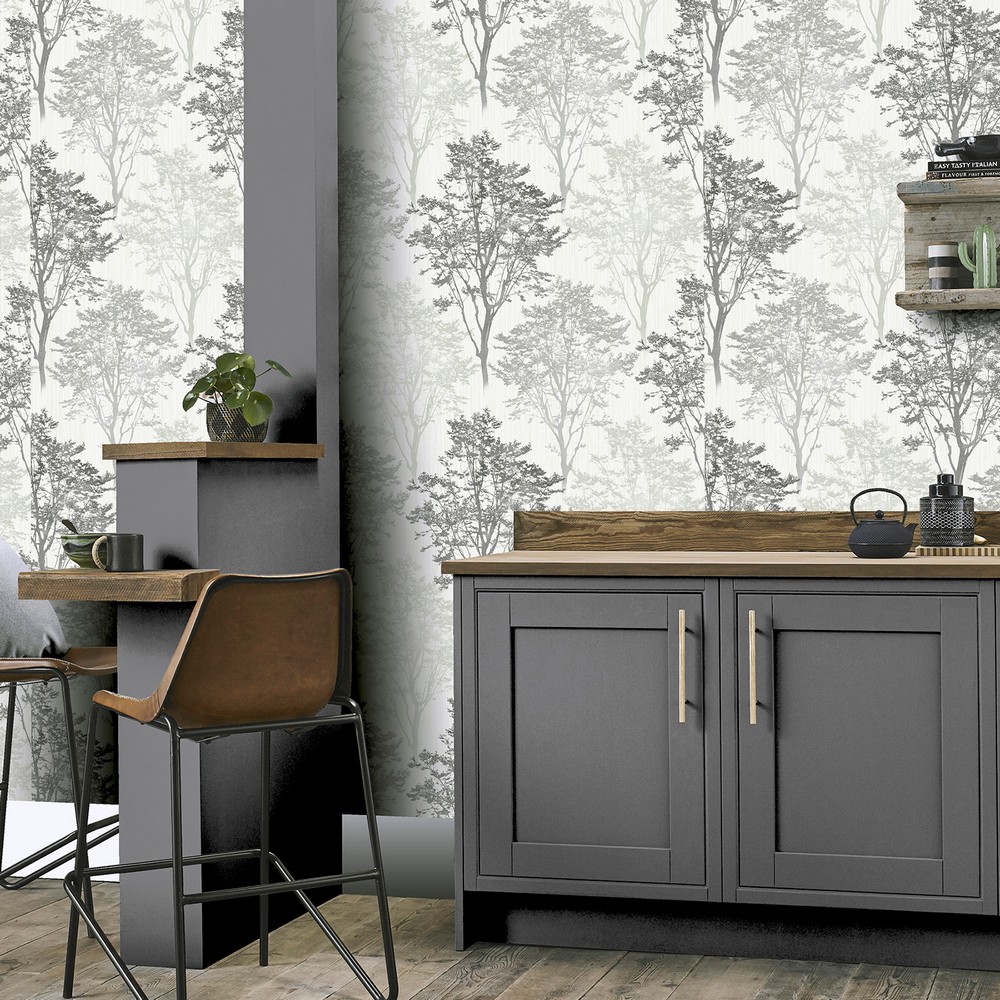 | Arthouse Arthouse | Edwin Grey Wildwood Wallpaper Match: Drop Repeat: 25.2 Scrubbable Roll is 20.9 Inches in width and 33 Feet in Length With About 57.5 square feet Coverage Unpasted Peelable Paste the Paper Colors: Greys Modern Trees Botanical |