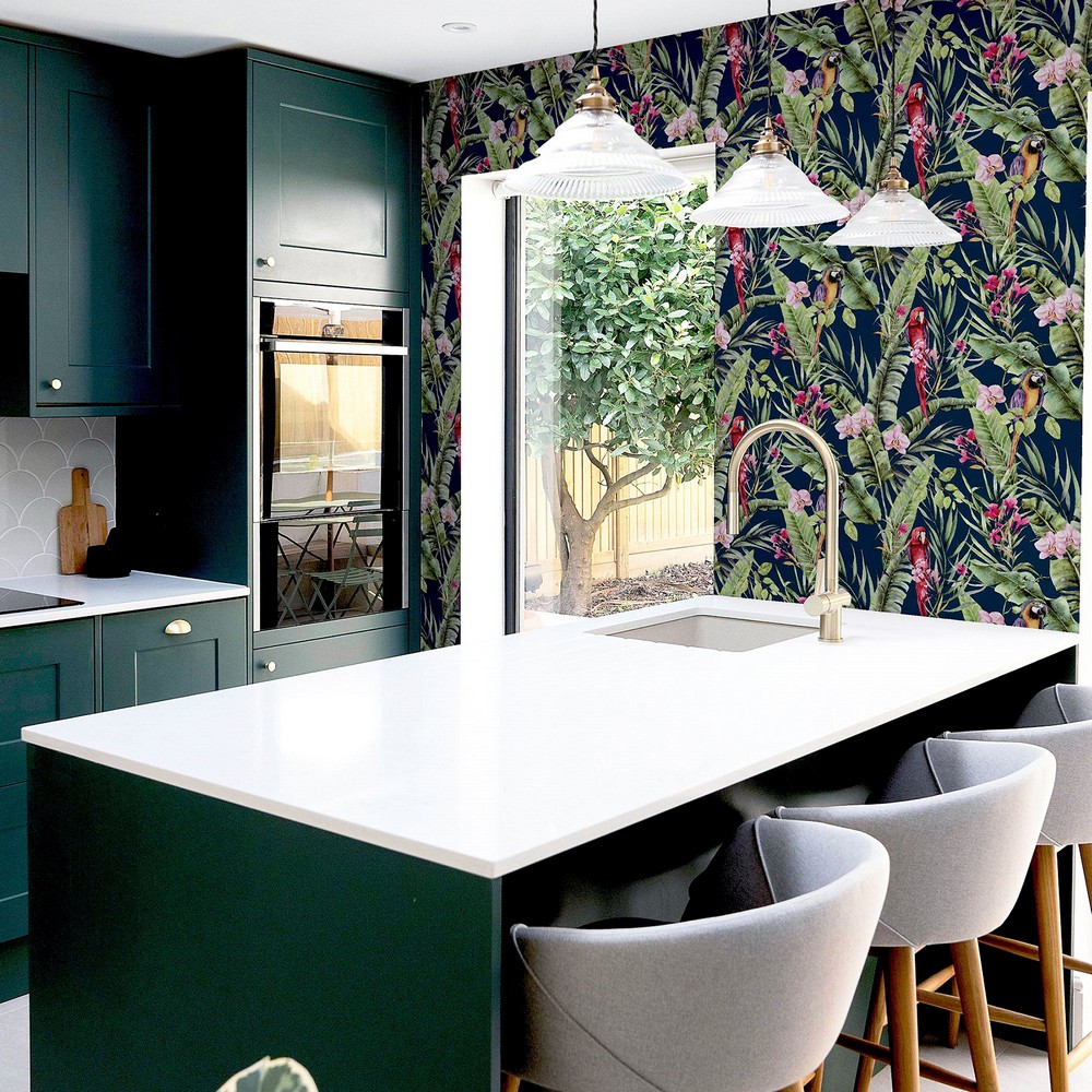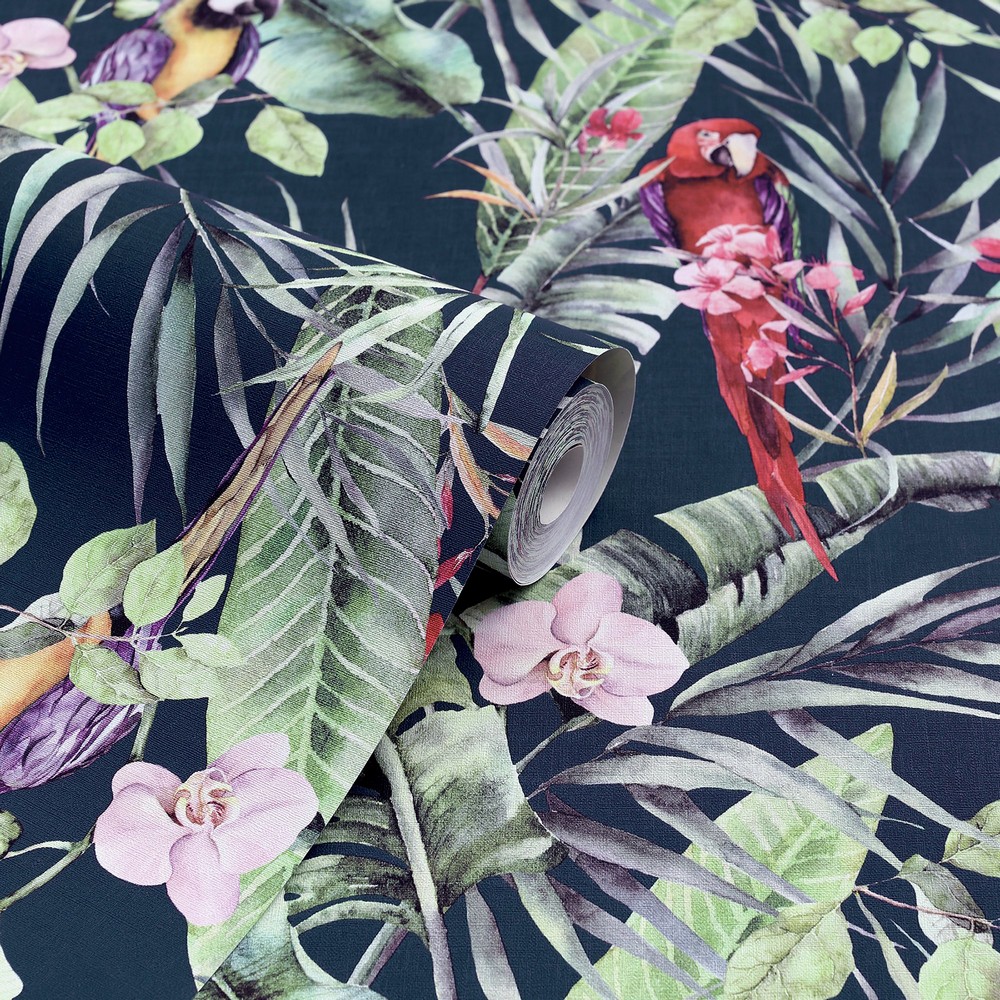 | Arthouse Arthouse | Rudy Navy Pretty Polly Wallpaper Match: Drop Repeat: 20.9 Extra Washable Roll is 20.9 Inches in width and 33 Feet in Length With About 57.5 square feet Coverage Unpasted Peelable Paste the Paper Colors: Blues Tropical Birds Animals |