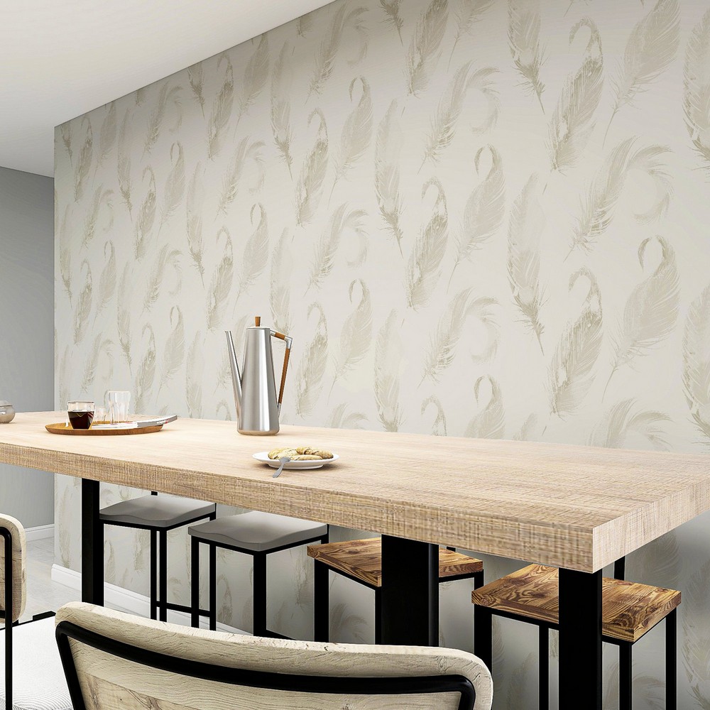 | Arthouse Arthouse | Natsuko Metallic Feathers Wallpaper Match: Drop Repeat: 20.9 Spongeable Roll is 20.9 Inches in width and 33 Feet in Length With About 57.5 square feet Coverage Unpasted Wet Removable Paste the Paper Colors: Neutrals Whimsical Novelty Graphics |
