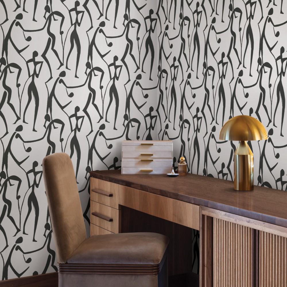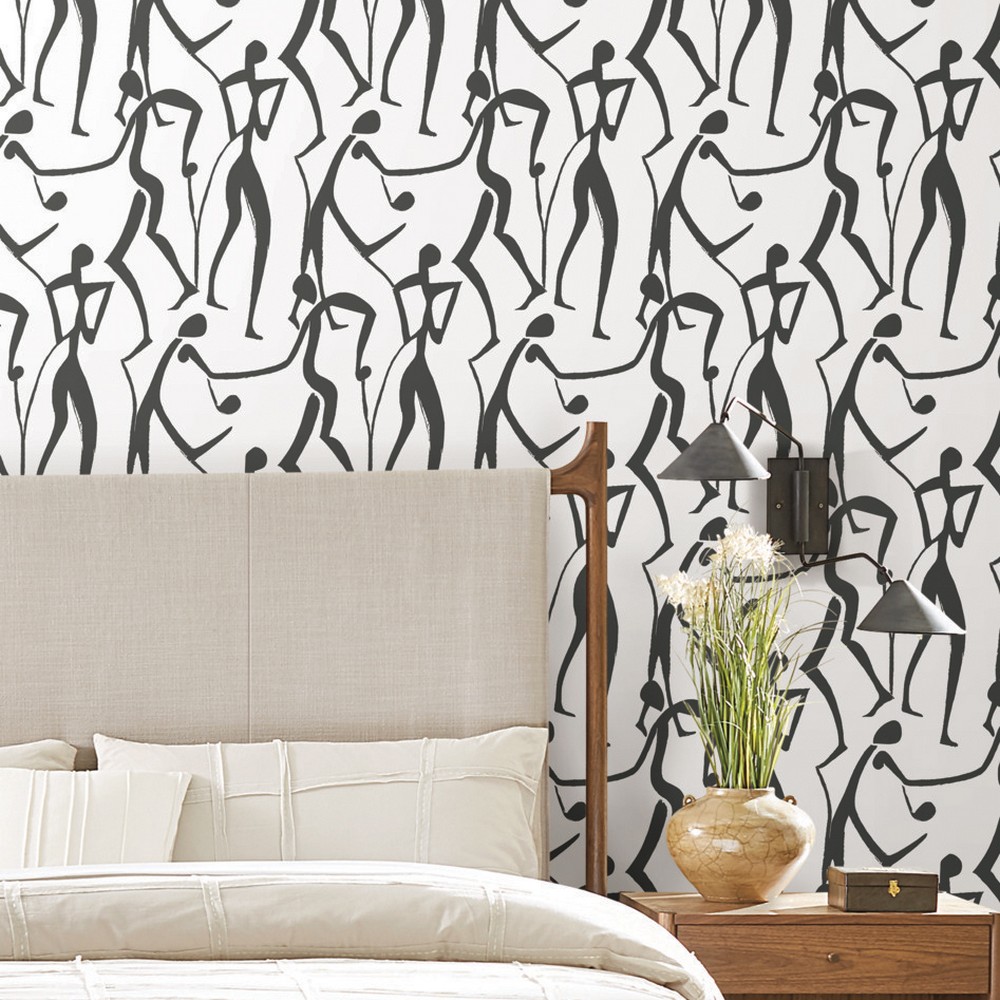 | York Wallcoverings Artisan Studio | Joyful Dancers Carbon Black Wallpaper Match: Straight Page: 6 Repeat: 24 Washable Roll is 20.5 Inches in width and 33 Feet in Length With About 56.4 square feet Coverage Unpasted Strippable Paste the Wall Colors: Blacks Modern Bohemian |