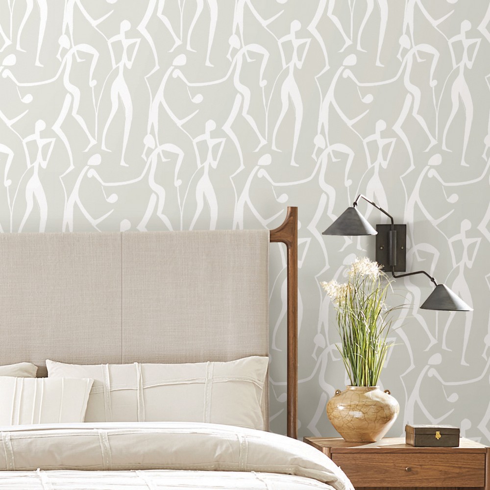 | York Wallcoverings Artisan Studio | Joyful Dancers Lichen Grey Wallpaper Match: Straight Page: 5 Repeat: 24 Washable Roll is 20.5 Inches in width and 33 Feet in Length With About 56.4 square feet Coverage Unpasted Strippable Paste the Wall Colors: Greys Modern Bohemian |