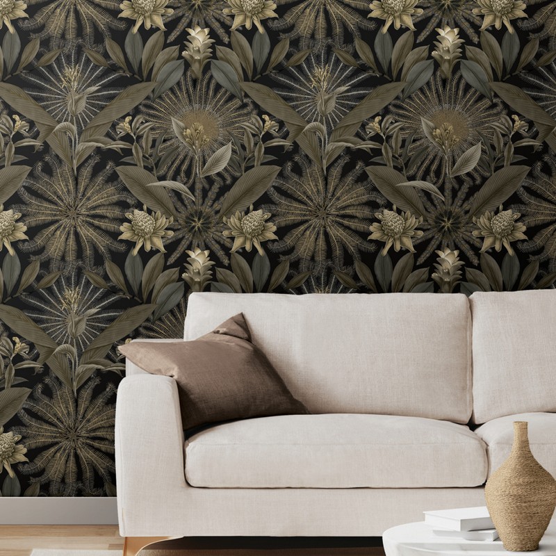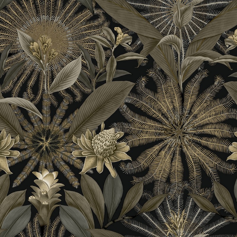 | Ronald Redding Caviar | Enchanted Garden Black Tropical Wallpaper Match: Straight Page: 25 Repeat: 24 Washable Roll is 27 Inches in width and 27 Feet in Length With About 60.8 square feet Coverage Unpasted Strippable Paste the Wall Colors: Blacks Bohemian Botanical Botanical |