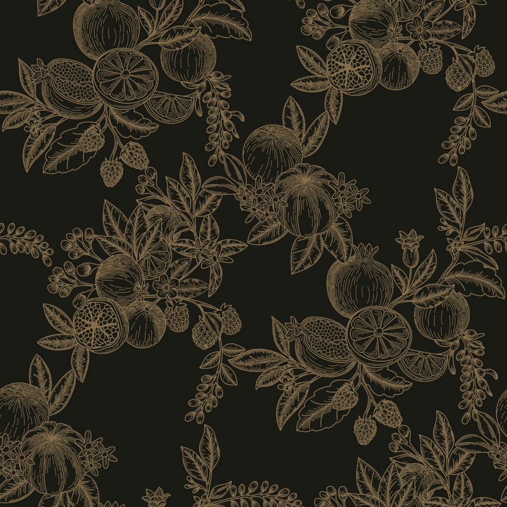 | A-Street Prints Chris Loves Julia | Gerty Gold Fruit Toile Wallpaper Match: Straight Page: 30 Repeat: 20.9 Washable Roll is 20.5 Inches in width and 33 Feet in Length With About 56.4 square feet Coverage Unpasted Strippable Paste the Wall Colors: Blacks Modern Fruit Botanical |