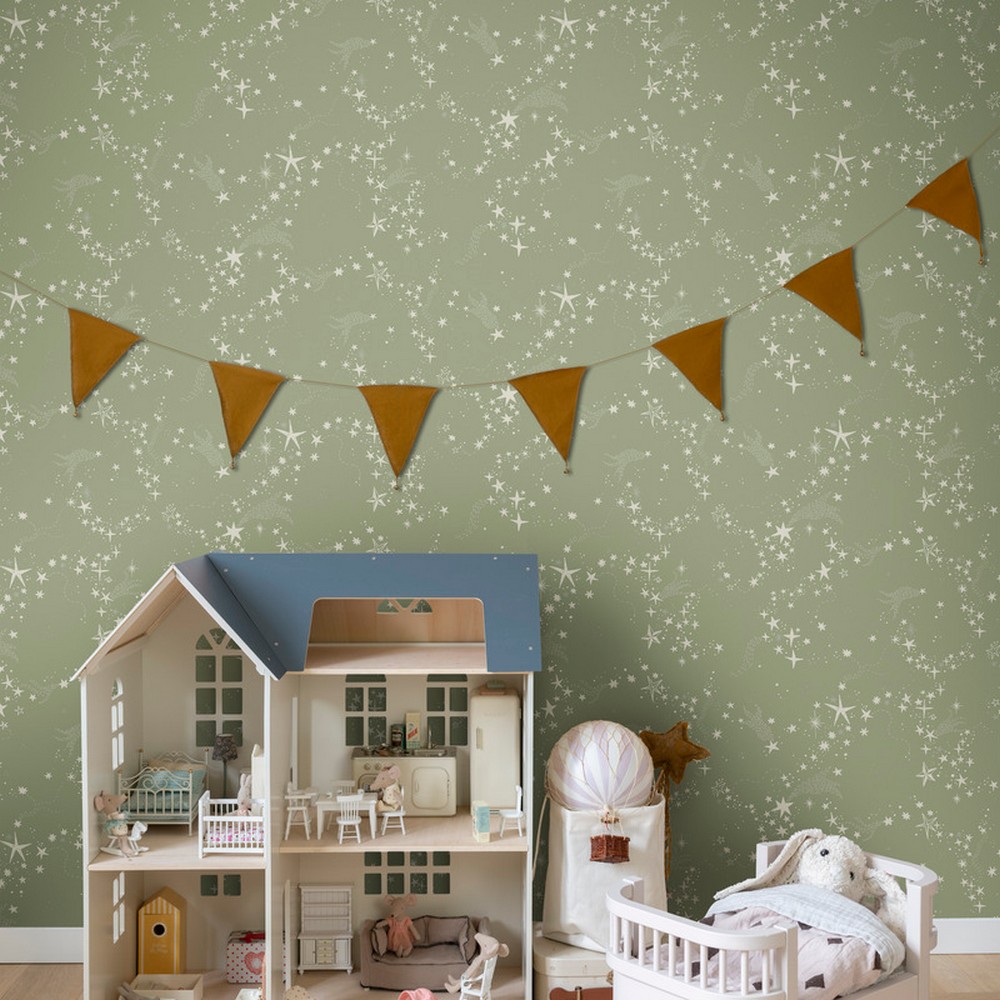 | York Wallcoverings Daydream | Stjarnhimmel Green Wallpaper Match: Drop Page: 37 Repeat: 20.9 Washable Roll is 20.9 Inches in width and 33 Feet in Length With About 57.5 square feet Coverage Unpasted Dry Strippable Paste the Wall Colors: Greens Whimsical Novelty |