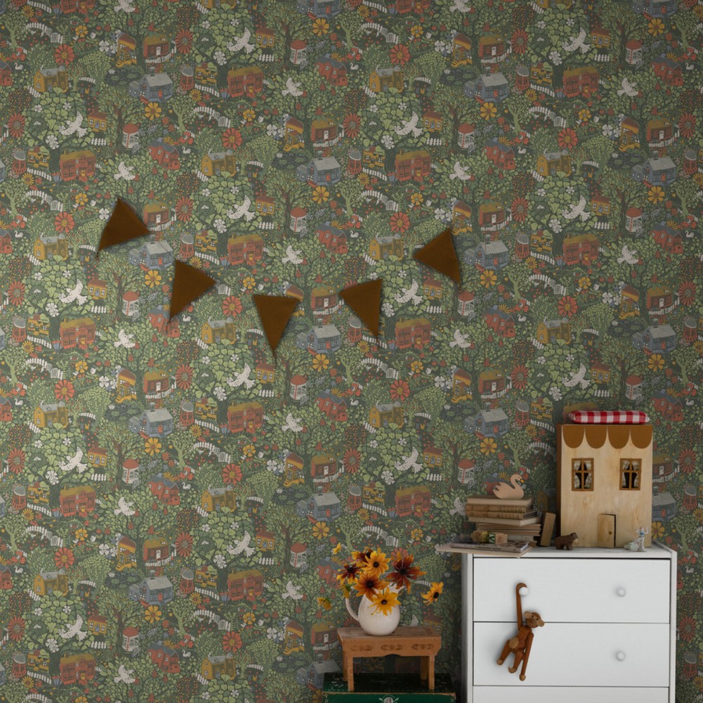 | York Wallcoverings Daydream | Bygga Bo Dark Green Wallpaper Match: Drop Page: 58 Repeat: 20.9 Washable Roll is 20.9 Inches in width and 33 Feet in Length With About 57.5 square feet Coverage Unpasted Dry Strippable Paste the Wall Colors: Greens Whimsical Novelty |