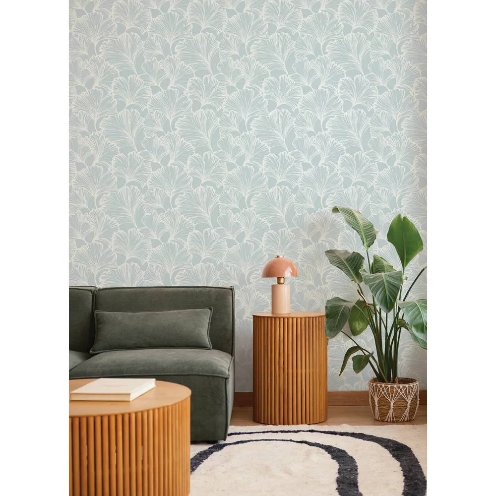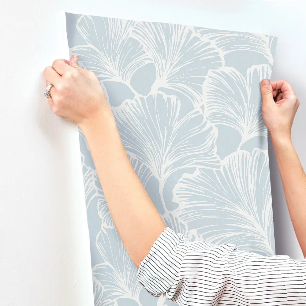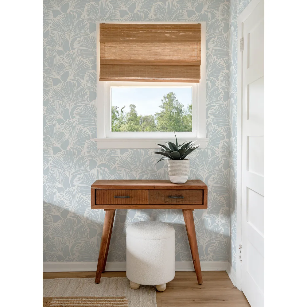 | A-Street Prints Drew & Jonathan Home Fifth Edition | Kyoto Sky Ginkgo Leaf Wallpaper Match: Straight Page: 34 Repeat: 20.9 Washable Roll is 20.5 Inches in width and 33 Feet in Length With About 56.4 square feet Coverage Unpasted Strippable Paste the Wall Colors: Blues Modern Leaves Botanical |