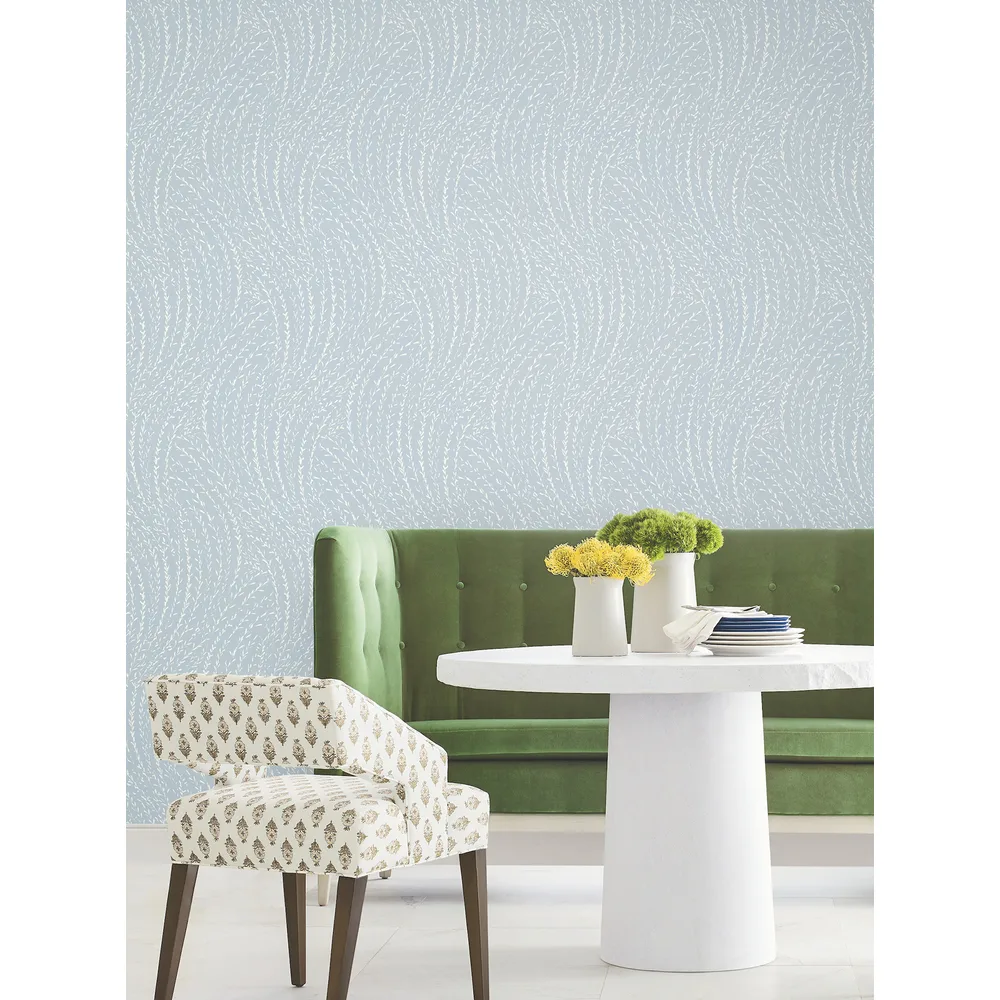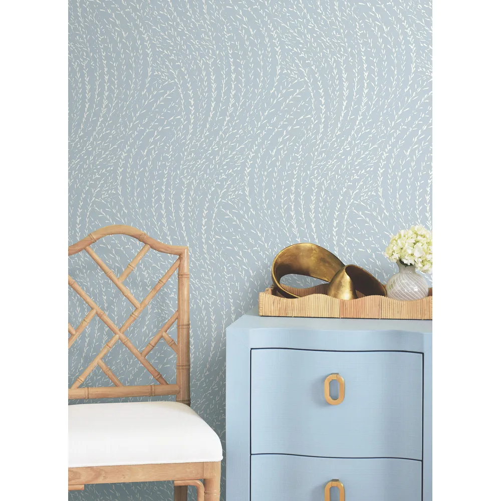 | Antonina Vella Layered Luxe | Willow Song Sky Blue Botanical Wallpaper Match: Straight Page: 22 Repeat: 25.25 Washable Roll is 27 Inches in width and 27 Feet in Length With About 60.8 square feet Coverage Unpasted Strippable Paste the Wall Colors: Blues Traditional Botanical Botanical |