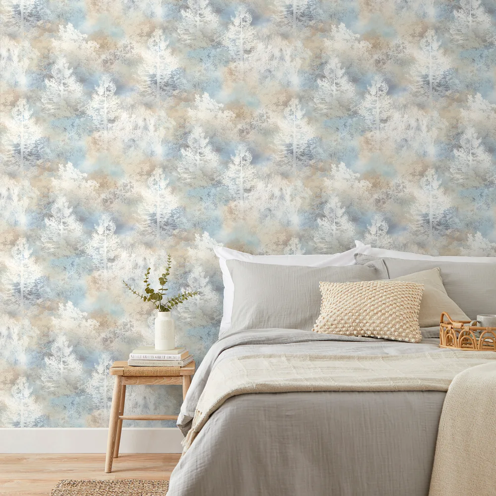 | Fine Decor Medley | Willem Blue Tree Wallpaper Match: Drop Repeat: 20.9 Washable Roll is 20.5 Inches in width and 33 Feet in Length With About 56.4 square feet Coverage Unpasted Peelable Paste the Paper Colors: Blues Modern Trees Botanical |