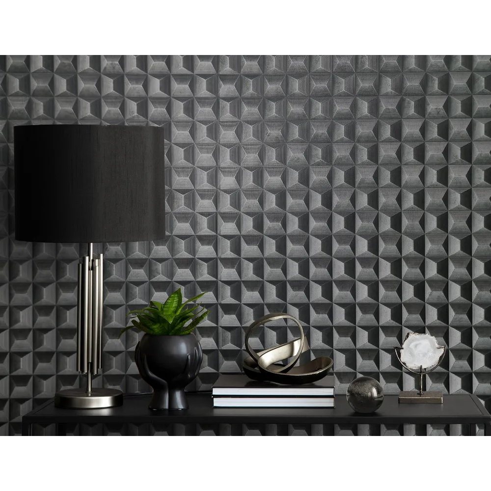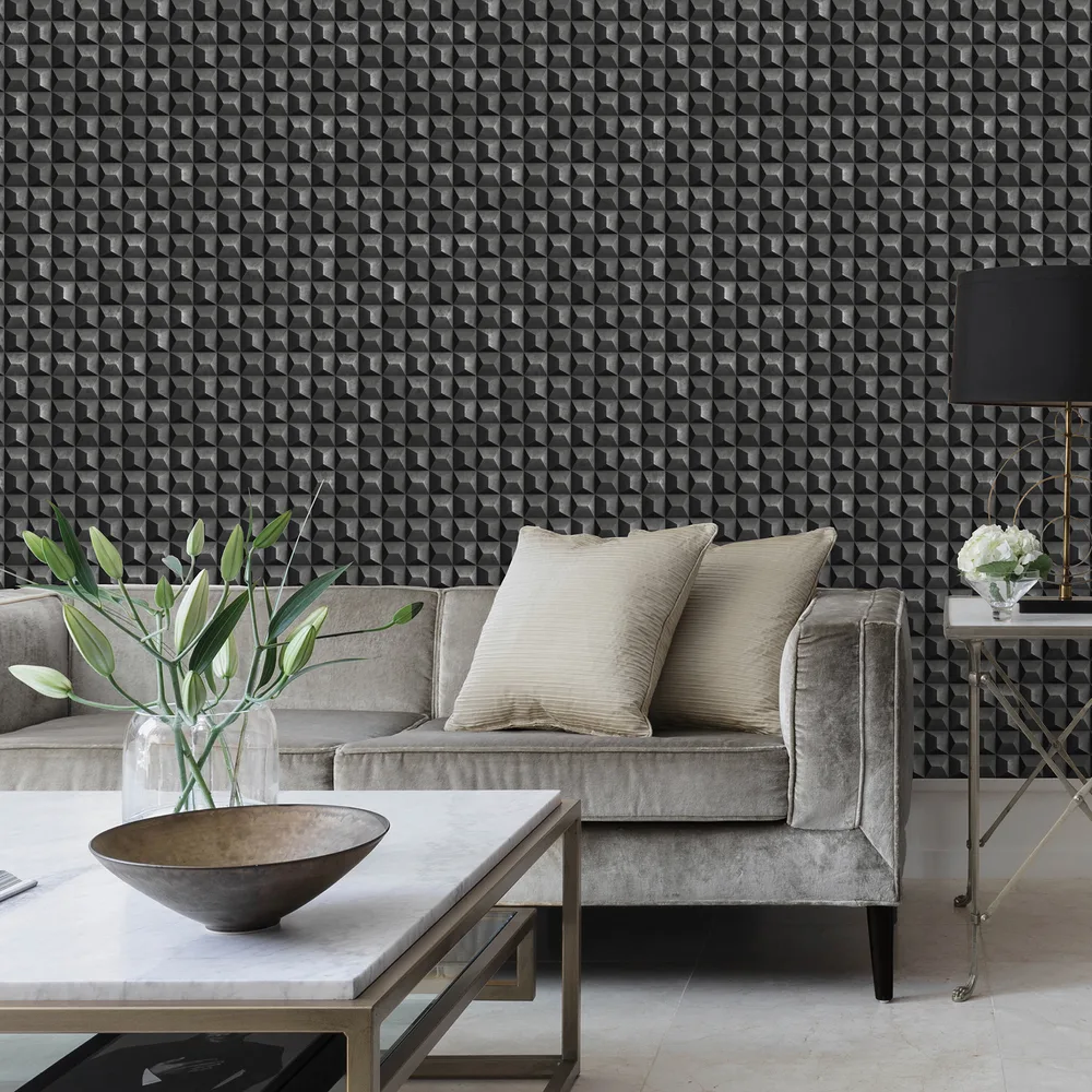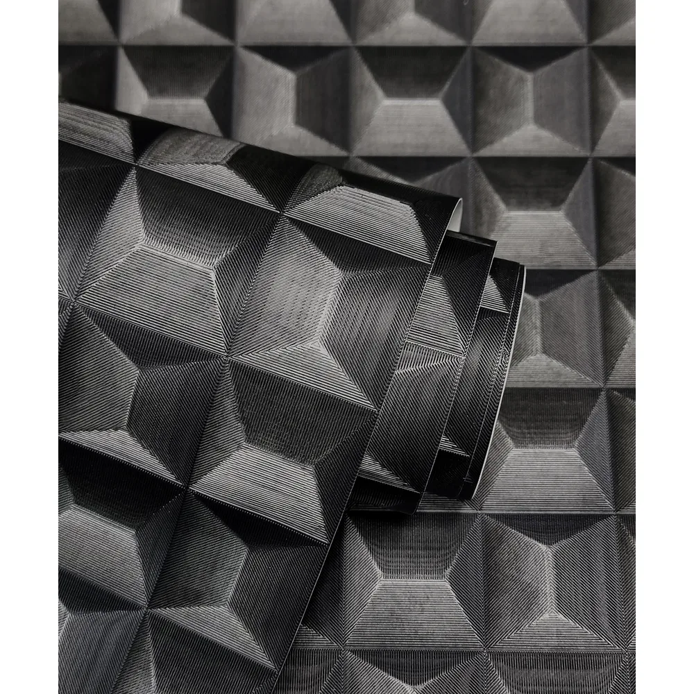 | Fine Decor Medley | Romero Black 3D Geometric Wallpaper Match: Straight Repeat: 20.9 Scrubbable Roll is 20.9 Inches in width and 33 Feet in Length With About 57.5 square feet Coverage Unpasted Peelable Paste the Paper Colors: Blacks Masculine Geometrics Graphics |