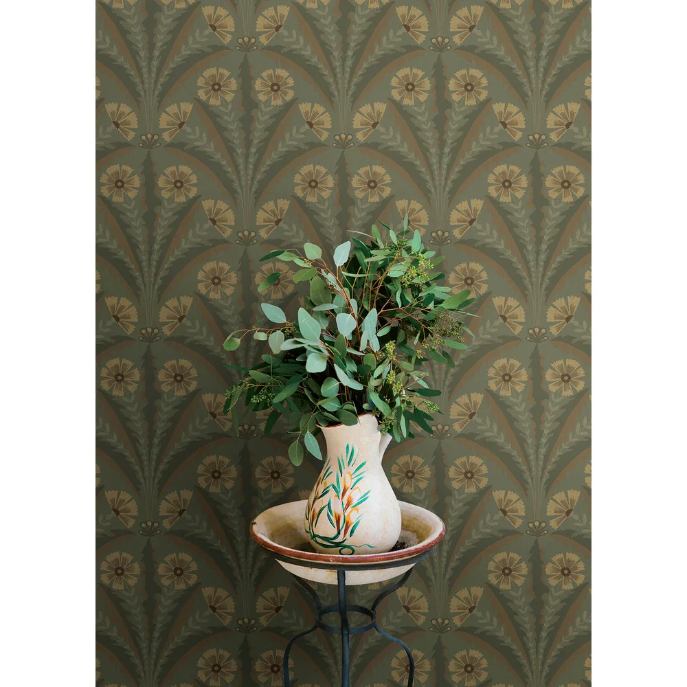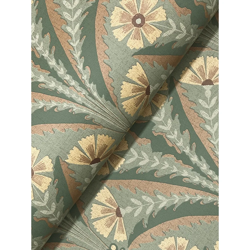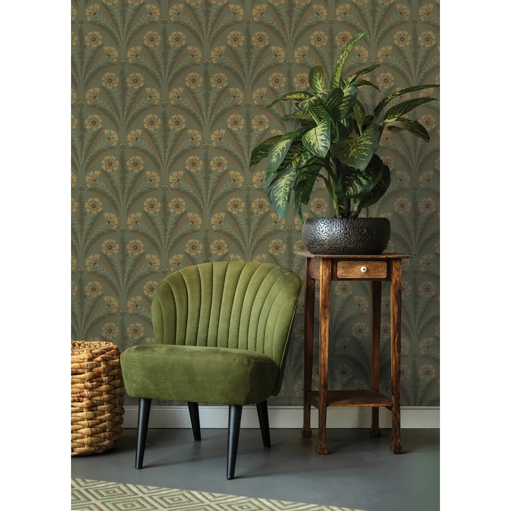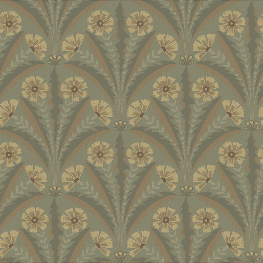 | Chesapeake Oak & Moss | Tap Root Green Floral Damask Wallpaper Match: Straight Page: 74 Repeat: 10.25 Washable Roll is 20.5 Inches in width and 33 Feet in Length With About 56.4 square feet Coverage Unpasted Strippable Paste the Wall Colors: Greens Modern Flowers Botanical |
