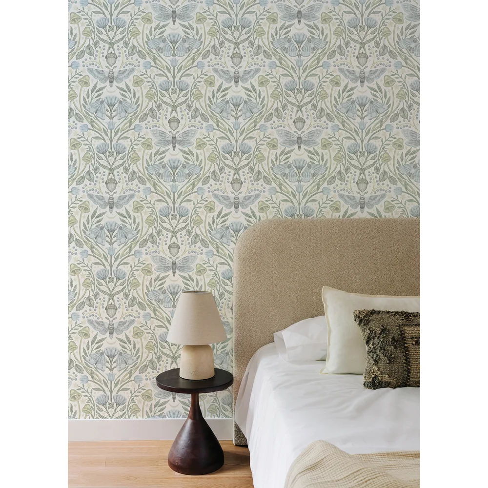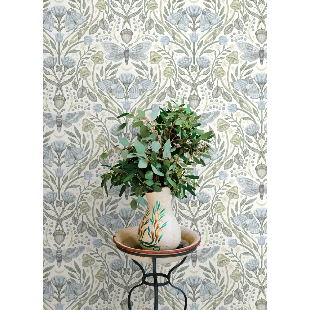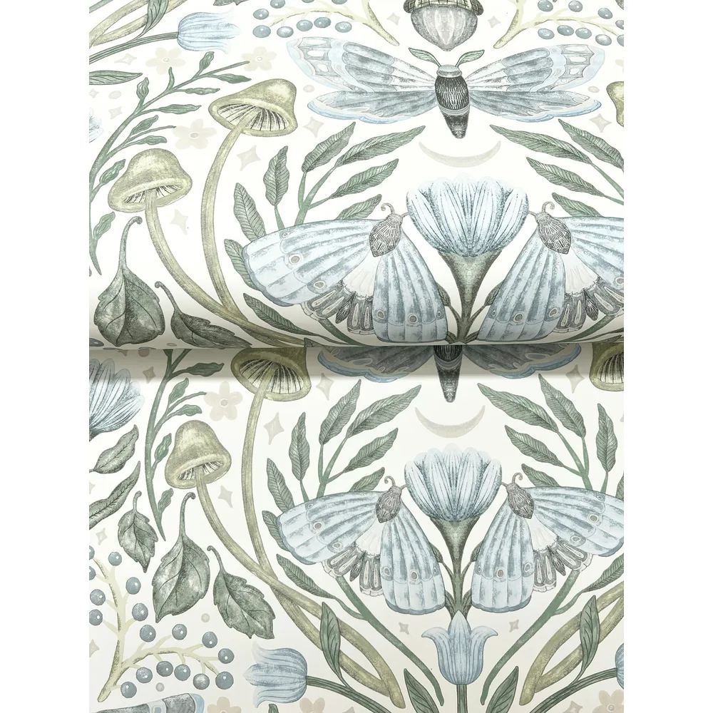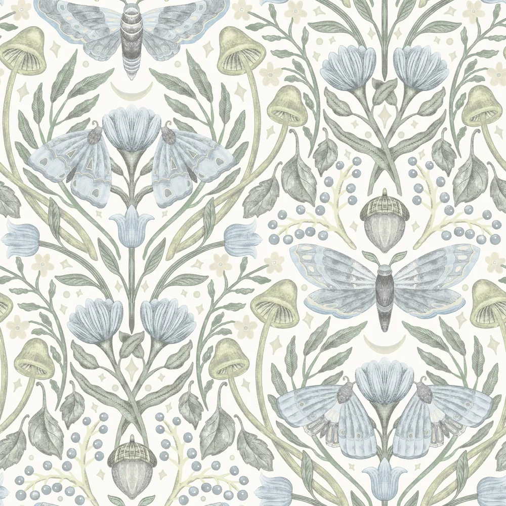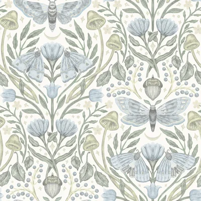 | Chesapeake Oak & Moss | Mystic Moth Sky Blue Forest Magic Wallpaper Match: Straight Page: 33 Repeat: 20.5 Washable Roll is 20.5 Inches in width and 33 Feet in Length With About 56.4 square feet Coverage Prepasted Strippable Prepasted Colors: Blues Eclectic Butterflies Animals |