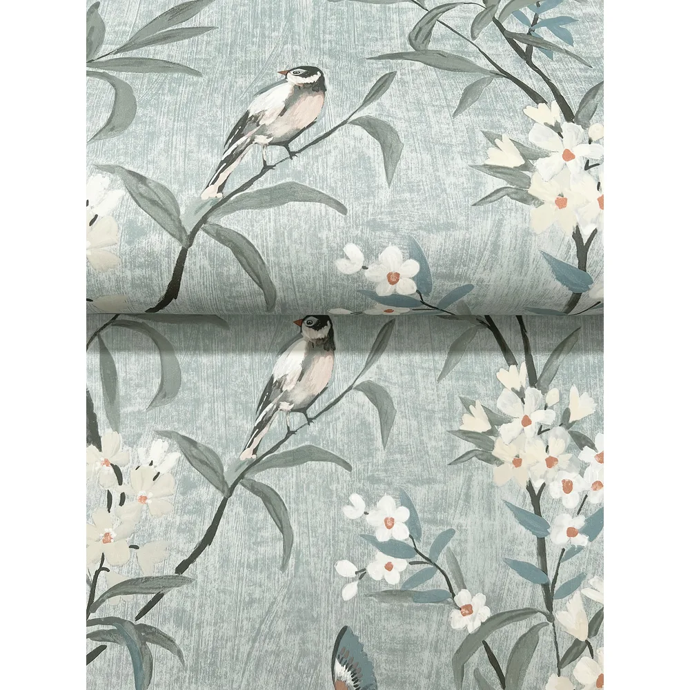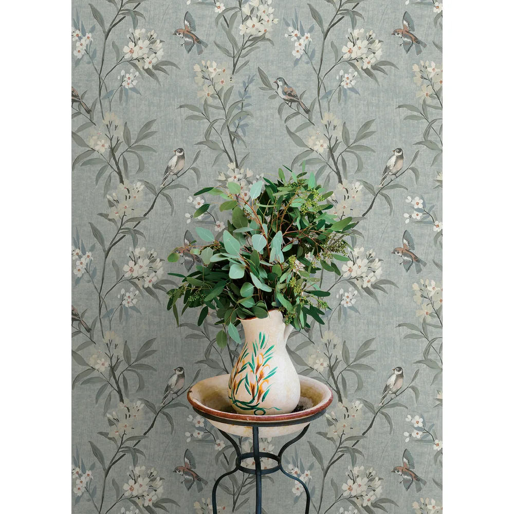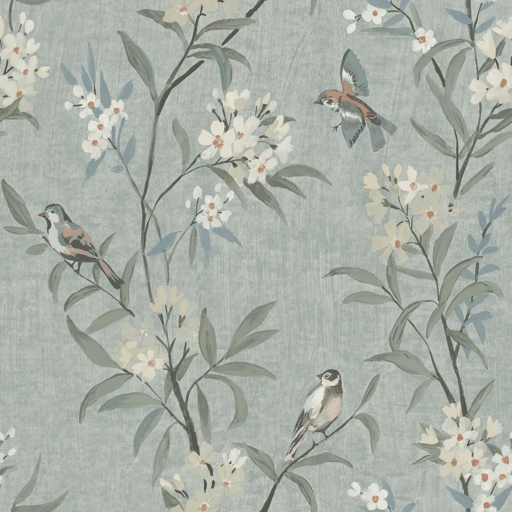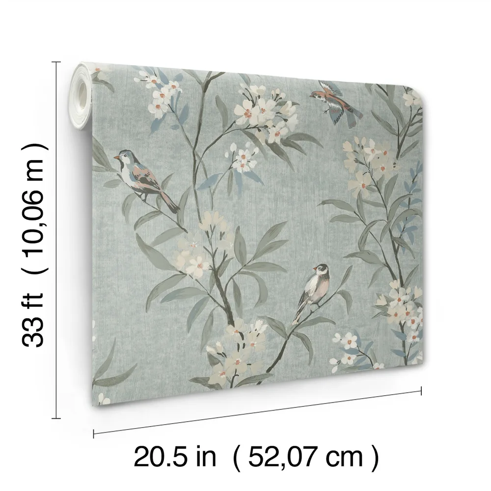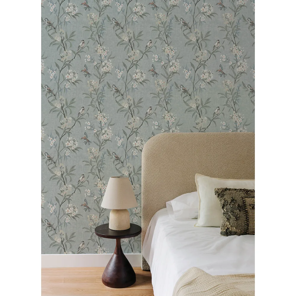 | Chesapeake Oak & Moss | Tea Olive Blue Finch Frolic Wallpaper Match: Straight Page: 61 Repeat: 20.5 Washable Roll is 20.5 Inches in width and 33 Feet in Length With About 56.4 square feet Coverage Prepasted Strippable Prepasted Colors: Blues Transitional Birds Animals |