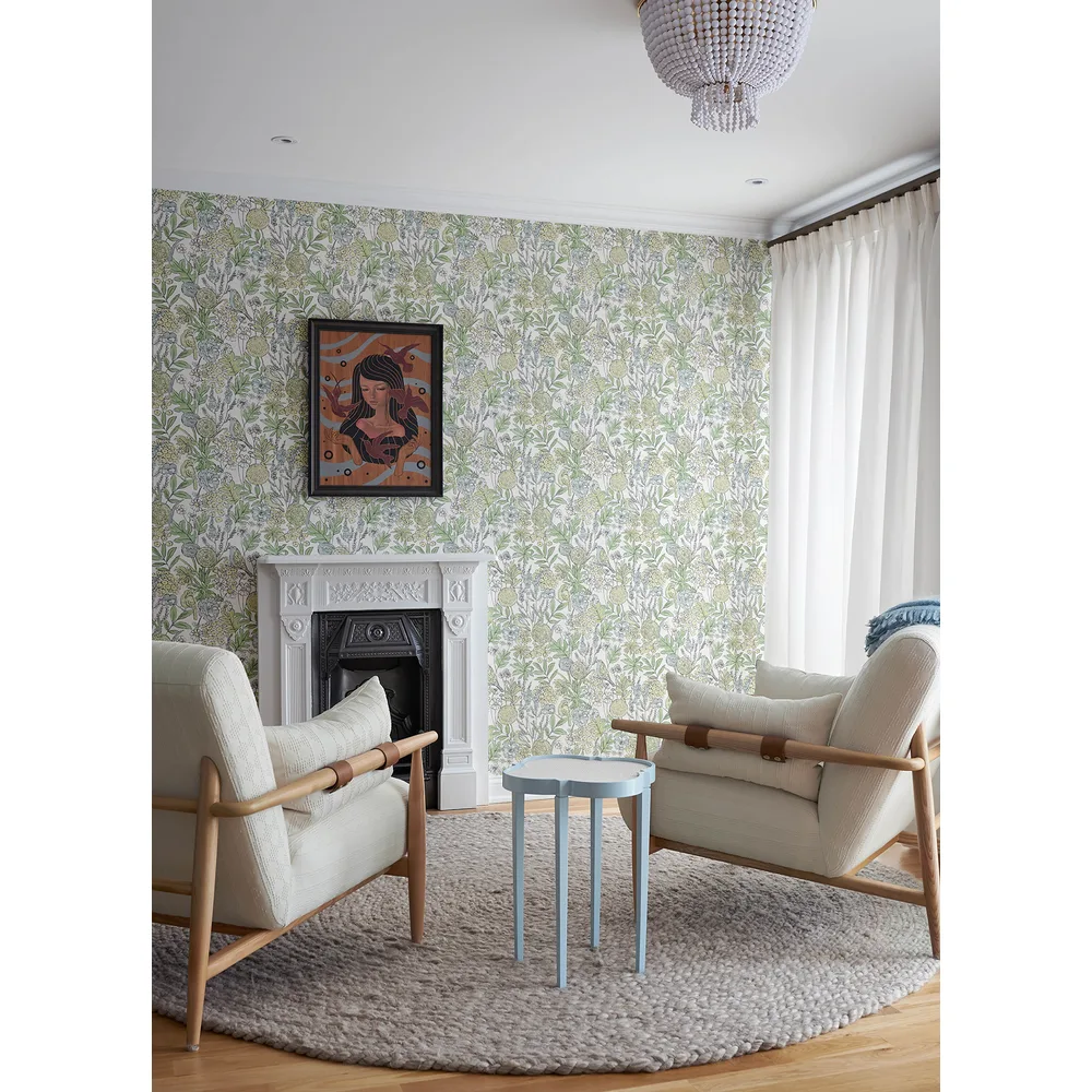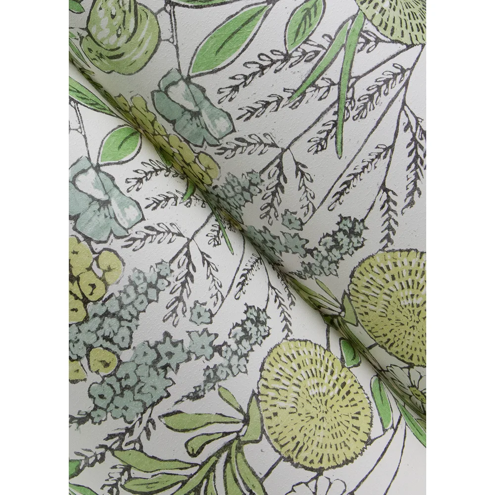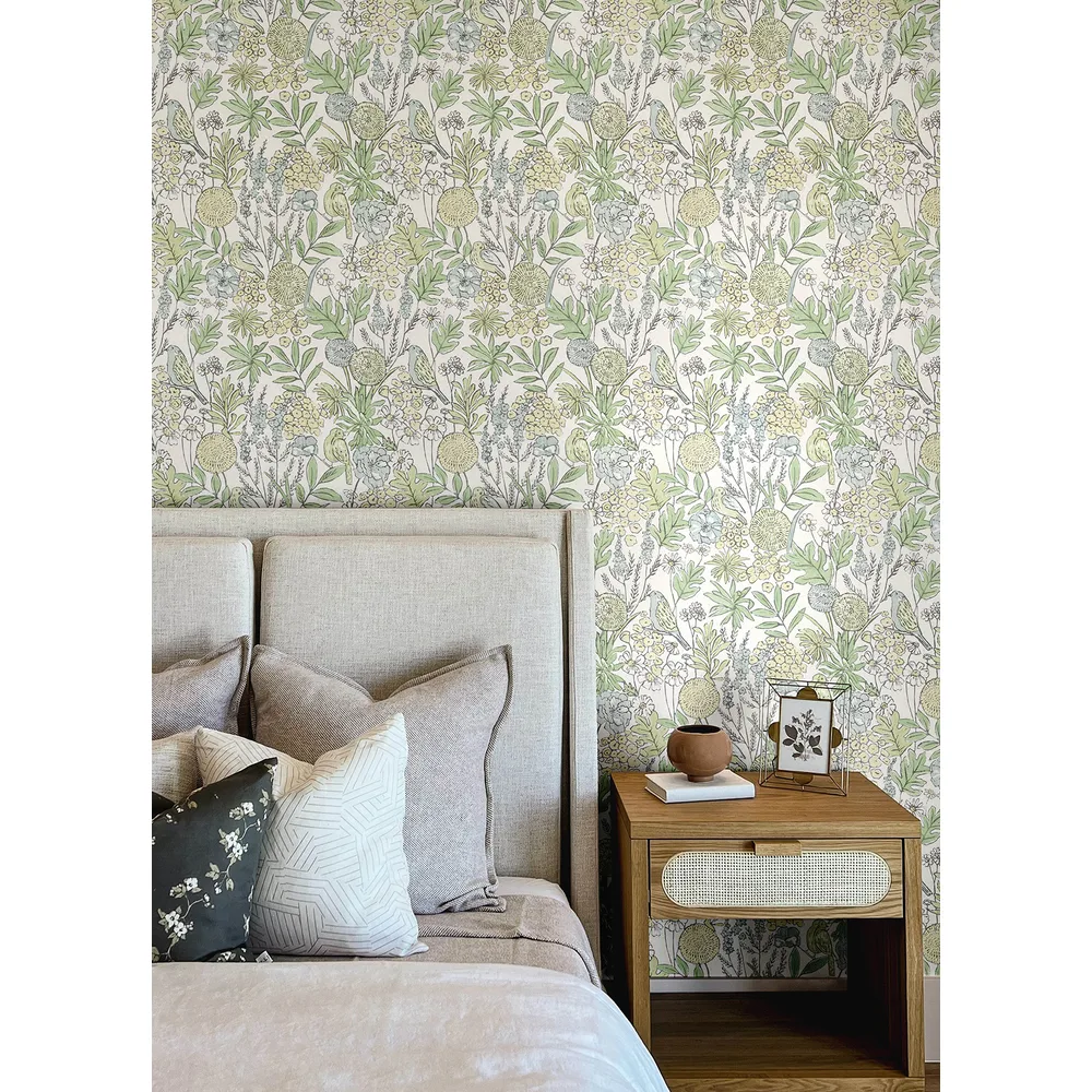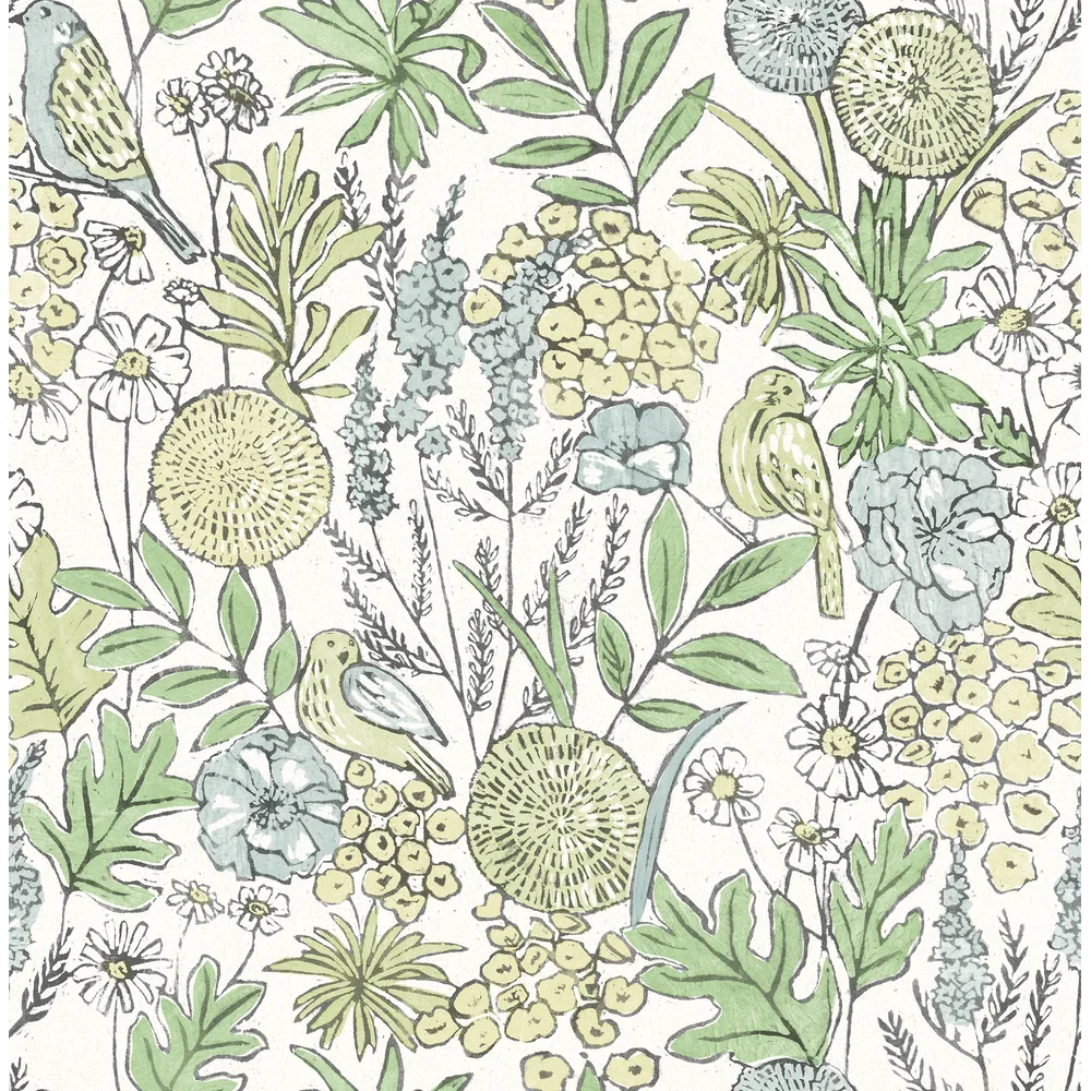 | Chesapeake PrintWorks | Goldfinch Green Birds and Blooms Wallpaper Match: Straight Page: 9 Repeat: 20.9 Washable Roll is 20.5 Inches in width and 33 Feet in Length With About 56.4 square feet Coverage Unpasted Strippable Paste the Wall Colors: Greens Farmhouse Birds Animals |