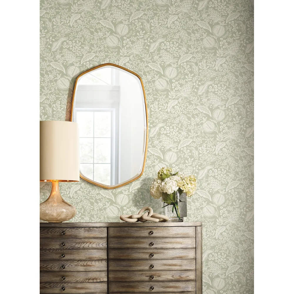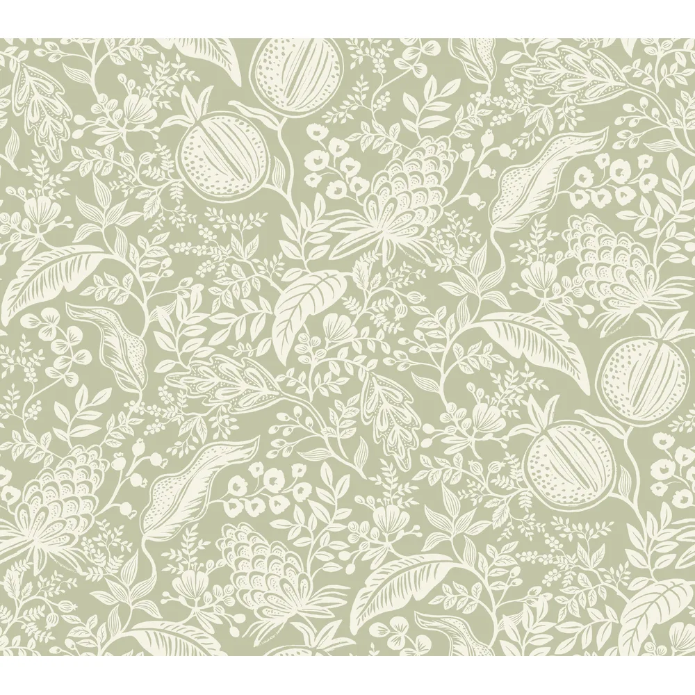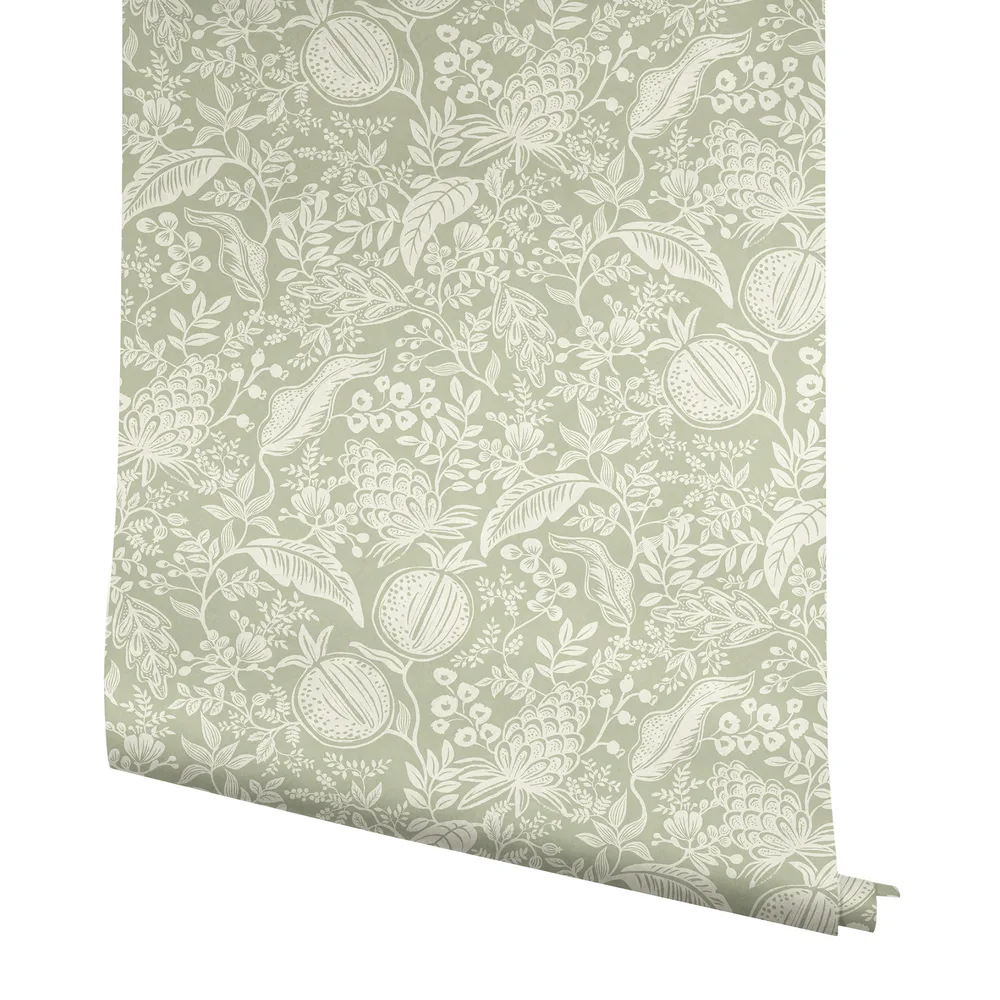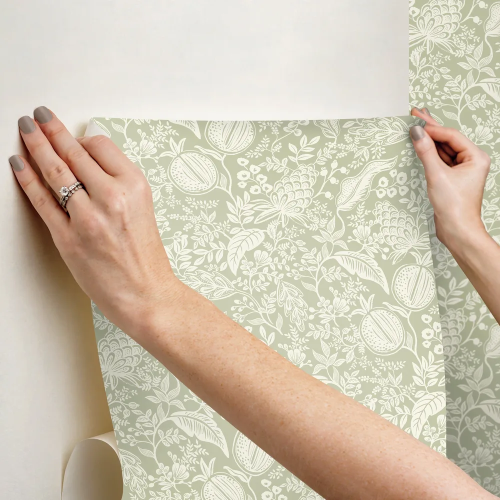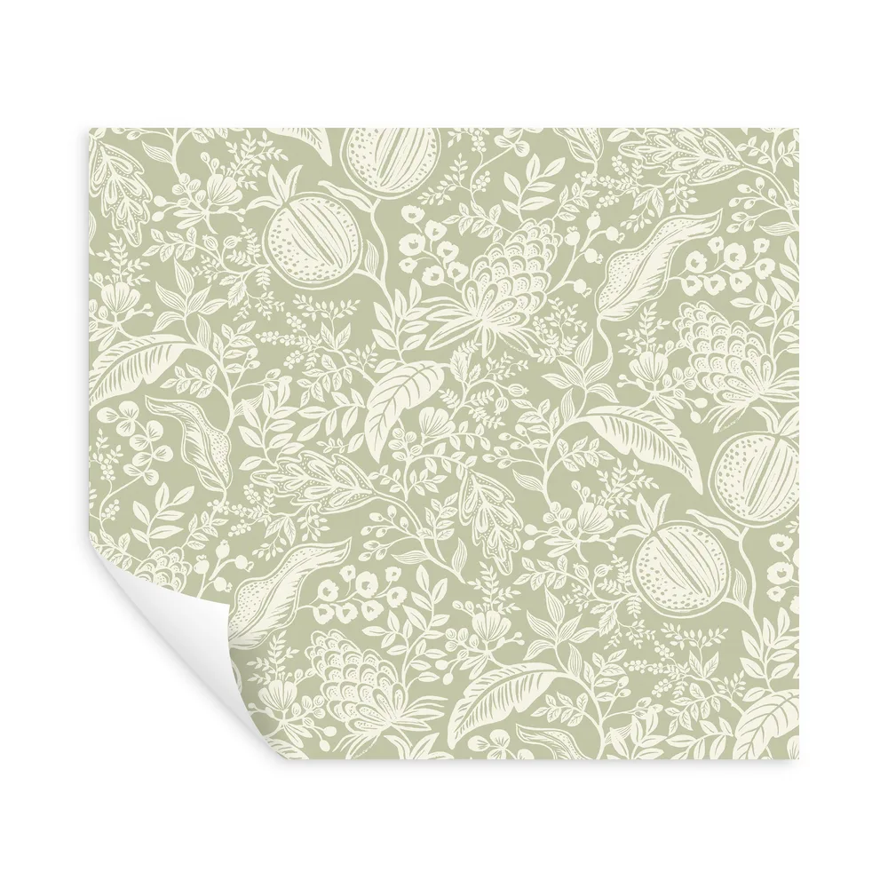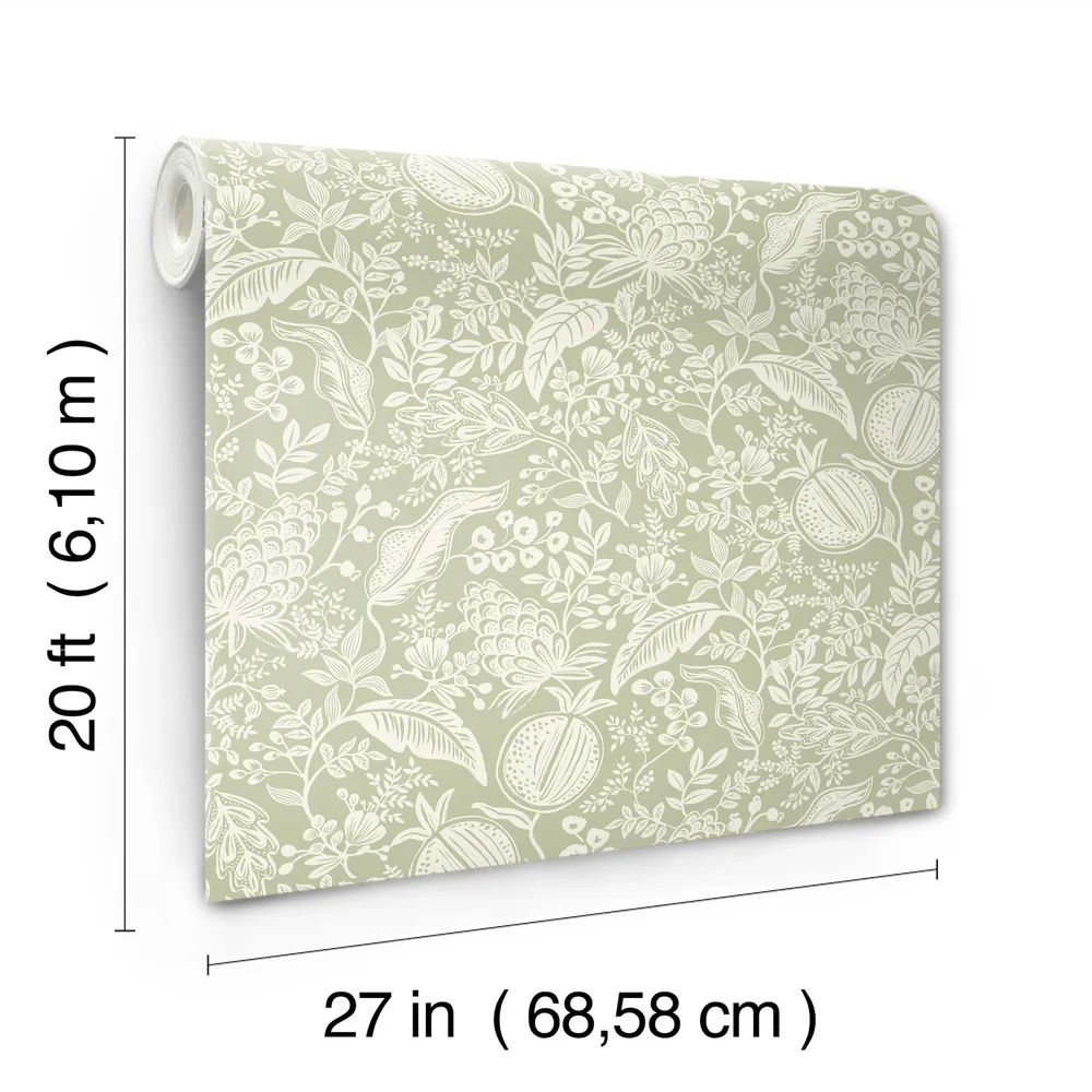 | Rifle Paper Co. Rifle Paper Co P+S 4th Edition | Pomegranate Pistachio Peel & Stick Wallpaper Match: Straight Repeat: 24 Washable Roll is 27 Inches in width and 20 Feet in Length With About 45 square feet Coverage Peel & Stick Fully Removable Peel & Stick Colors: Greens Farmhouse Botanical |