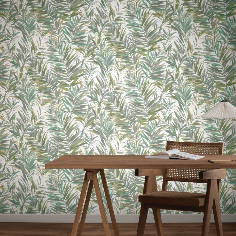 | York Wallcoverings Woodnote Swaying Palms Olive & Aegean Wallpaper Match: Drop Repeat: 24 Washable Roll is 27 Inches in width and 27 Feet in Length With About 60.8 square feet Coverage Unpasted Strippable Paste the Wall Colors: Greens Tropical Botanical |