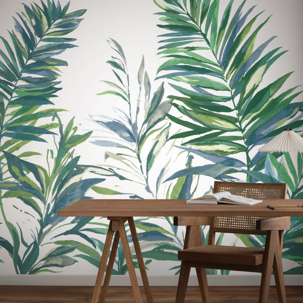 | York Wallcoverings Woodnote Swaying Palms Green & Blue Mural Washable Roll is 33.3 Inches in width and 11.2 Feet in Length With 4 panels - Measures 11.08-ft wide by 11.2-ft tall when assembled Coverage Unpasted Strippable Paste the Wall Colors: Blues Tropical Botanical |