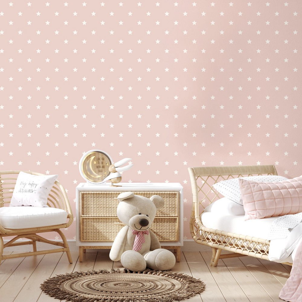 | Advantage World of Imagination Starry Motif Pink Geometric Wallpaper Match: Straight Repeat: 5.21 Washable Roll is 20.5 Inches in width and 33 Feet in Length With About 56.4 square feet Coverage Unpasted Strippable Paste the Wall Colors: Pinks Whimsical Stars Graphics |