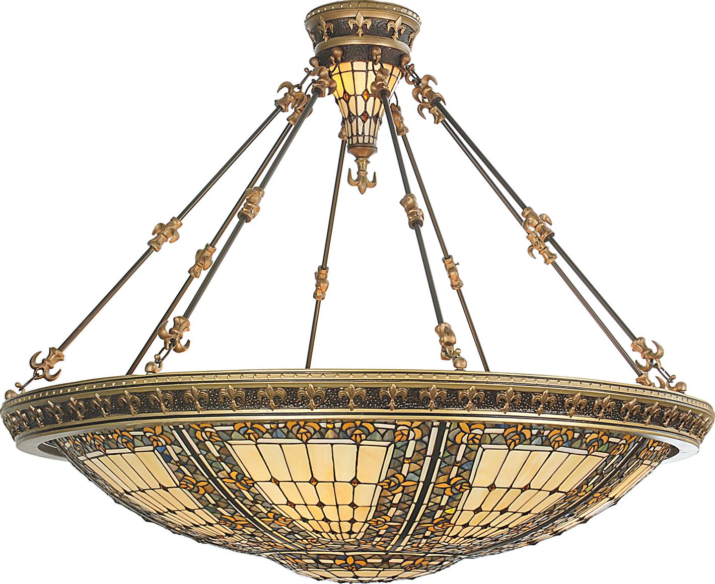 | A Meyda Tiffany Original Design, The Fleur-De-Lis Is An Elegant Design Of Golden Stylized Three-Petaled Irises And Amber Colored Jewels. The Stained Glass Shade Is Reminiscent Of Old World Castles And Cathedrals. Meyda Tiffany INVERTED PENDANT |
