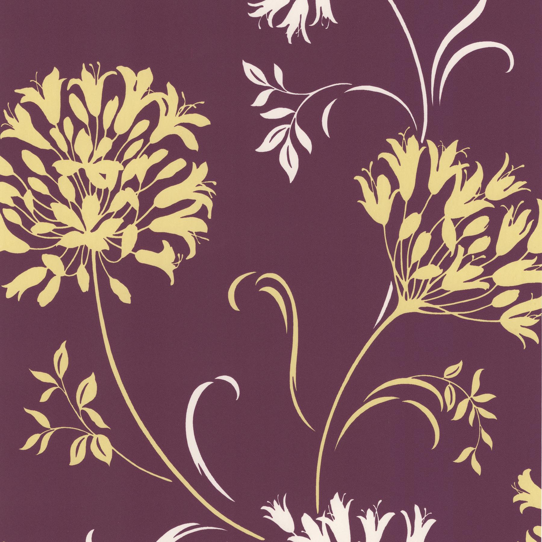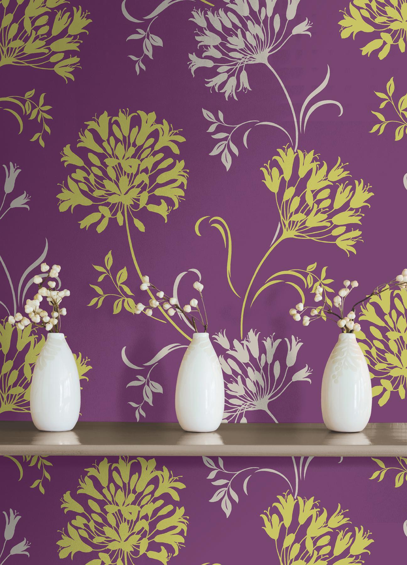 | A juicy purple hue, popping with vivacious chartreuse and platinum. This current flower wallcovering presents deluxe texture effects and an enchanted silhouette design. |