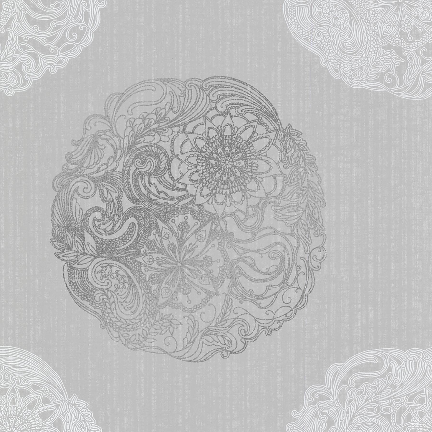 | Floating medallions in gleaming silver and white are radiant against a foggy grey landscape. With a new, Moroccan vibe, this decadent look presents a global spirit to walls. Page: 32 Match: Straight Single Double Roll Width (in): 20.5 Single Double Roll Length (ft): 16.5 Unpasted Strippable |