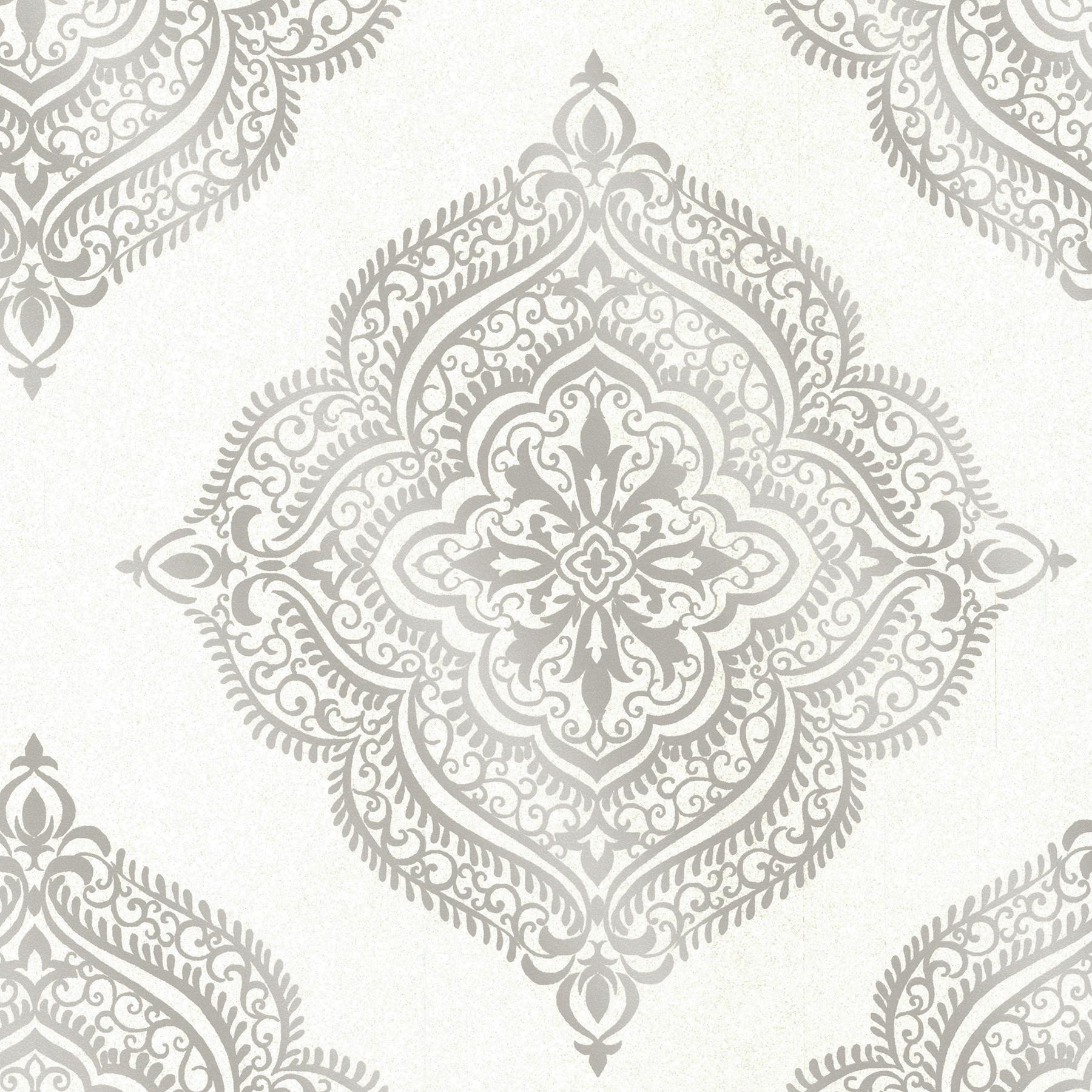 | A magnificent cream backdrop with a delicate glitter effect paves a decadent path for this gleaming flock of silver medallions. A rare and lovely site on walls filled with both enchantment and wonder. Page: 23 Match: Straight Single Double Roll Width (in): 20.5 Single Double Roll Length (ft): 16.5 Unpasted Strippable |