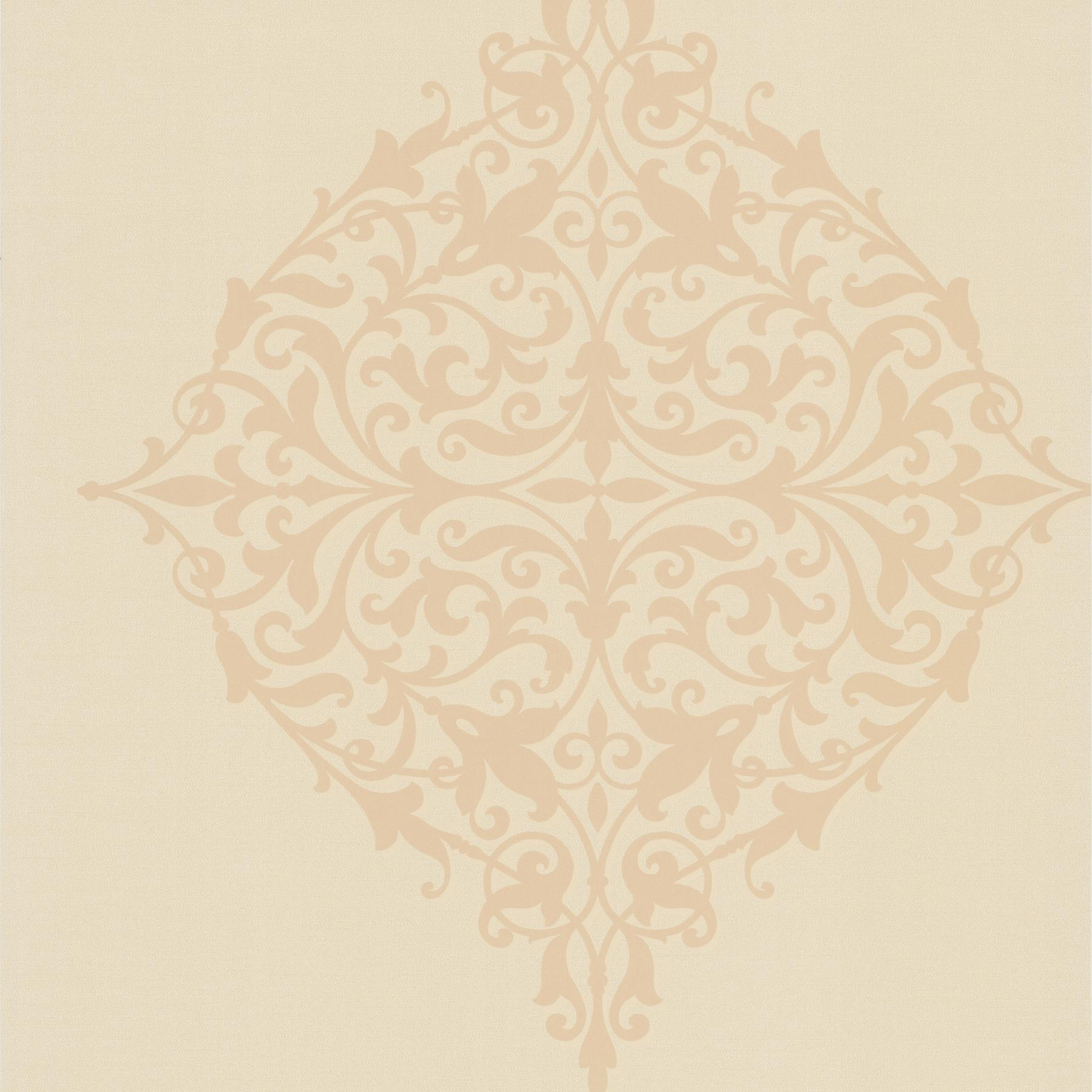 A decadent and classy medallion wallcovering in warm butterscotch taupe.