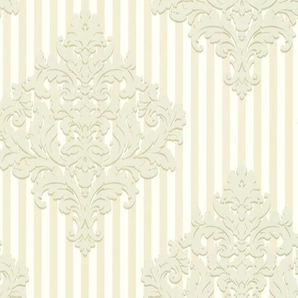 A perfect marriage of a soft stripe and regal damask transforms this neutral wallcovering into a trendy decor piece that shimmers with a warm pearlescent glow.