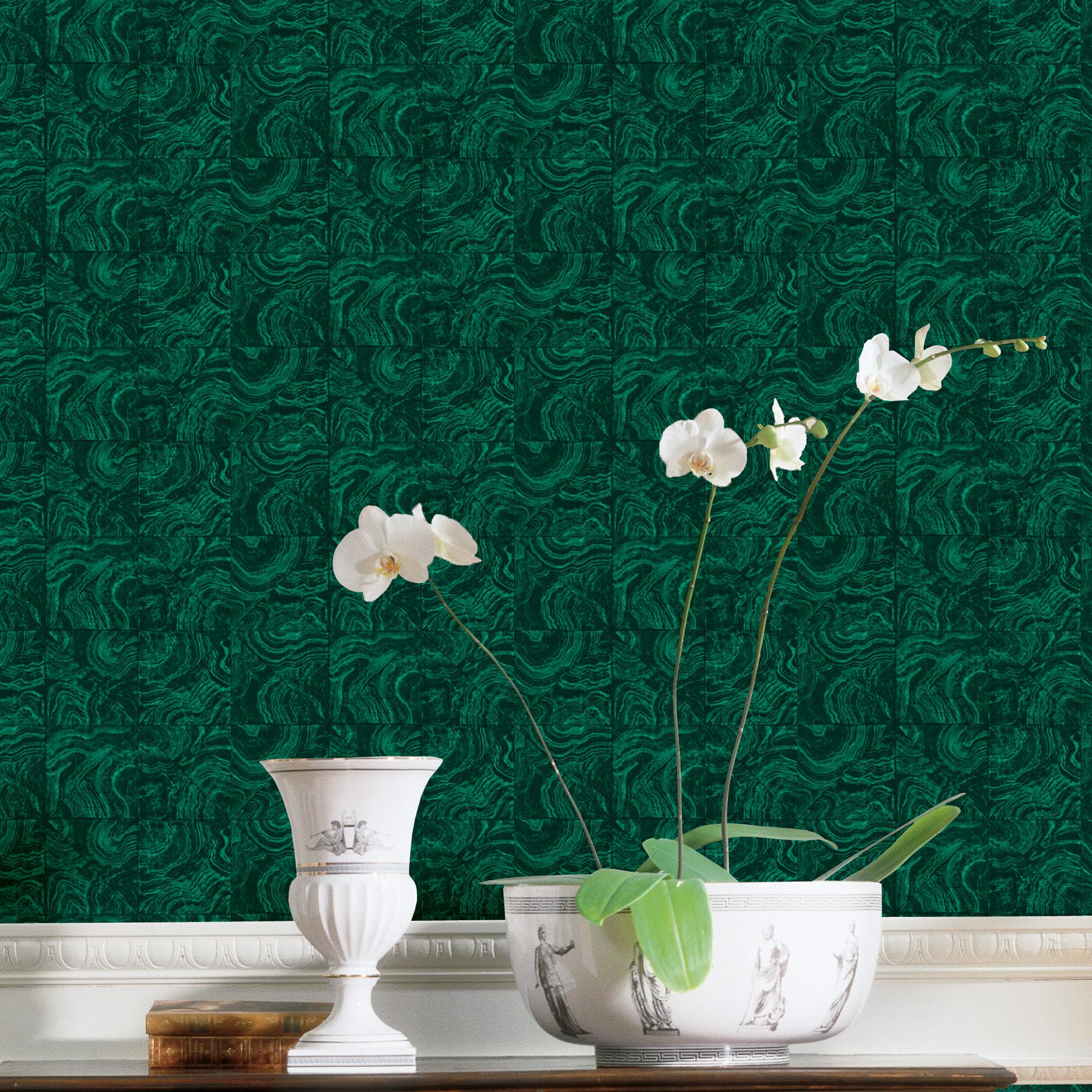 | In a gorgeous emerald green hue this tile wallcovering presents an organic brilliance to walls with a design mimicking the look of a swirling malachite stone. Page: 42 Match: Straight Single Roll Width (in): 27 Single Roll Length (ft): 13.5 Unpasted Strippable |