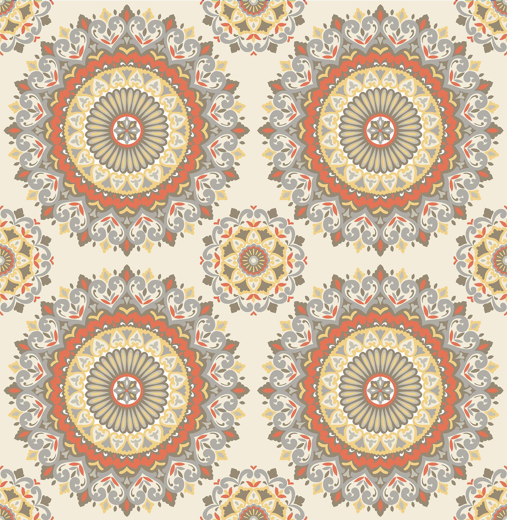 | lovely coral grey and yellow medallions make a fascinating kaleidoscope effect on walls. Evocative of the romantic suzani fabrics of Central Asia and the Middle East this bohemian hip wallcovering enchants with brilliant bursts of color and a gorgeous Page: 18 Match: Straight Roll Width (in): 20.5 Roll Length (ft): 16.5 Unpasted Strippable |