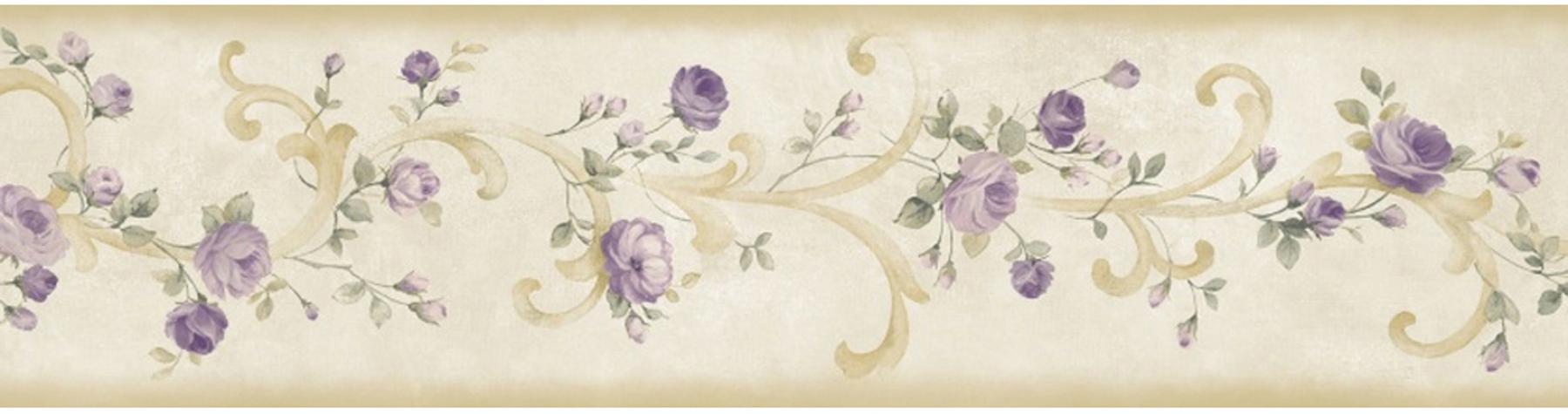 | This exceptionally handsome wall paper border of a regal acanthus scroll presents a sophisticated elegance to walls with decadent purple roses upon a hip aged backdrop. Page: 192 Single Double Roll Width (in): 6 Single Double Roll Length (ft): 15 Prepasted Strippable |