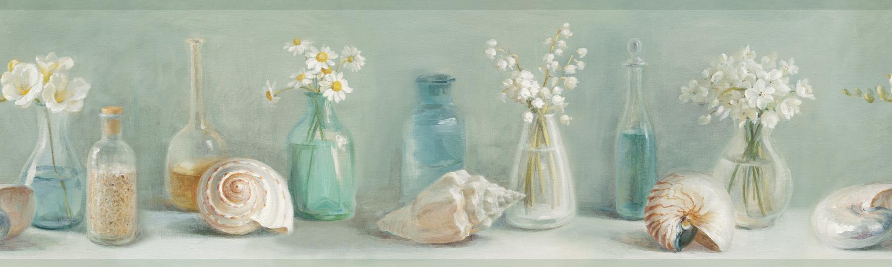 | In an exquisite sea glass color this ocean inspired wall paper border is like an accessory for walls. Hand-painted vases filled with daisies and lily of the valley as well as fabulous white seashells adorn this graceful artistic design. Page: 130 Single Double Roll Width (in): 8 Single Double Roll Length (ft): 15 Prepasted Strippable |