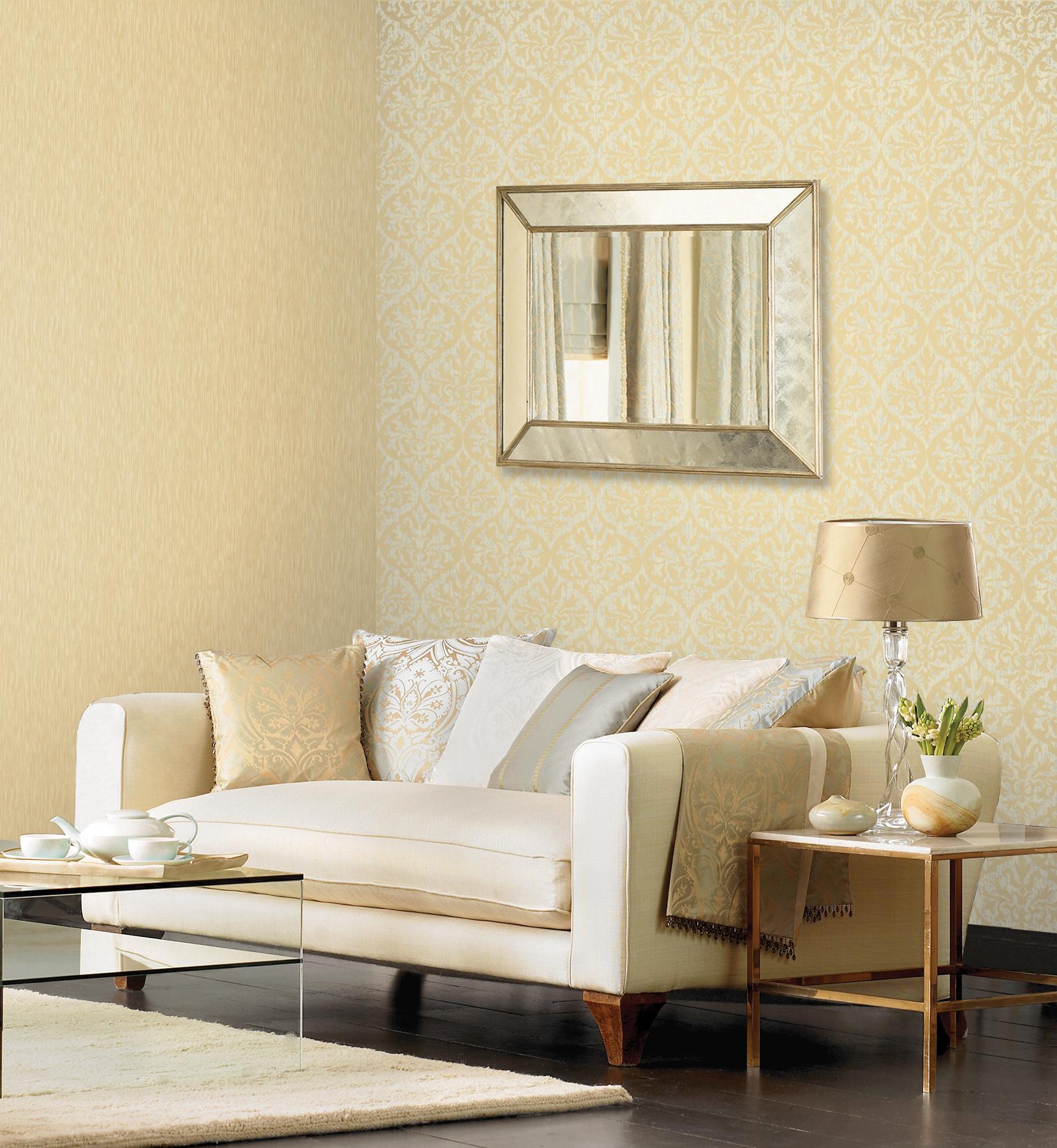 | With a cultured ikat damask design this gold cream and silver wallcovering lends a well-traveled poise to a room. The soft silk texture and glitter ink makes a romantic global-hip fabric effect on walls. Page: 15 Match: Straight Roll Width (in): 20.5 Roll Length (ft): 16.5 Unpasted Strippable |