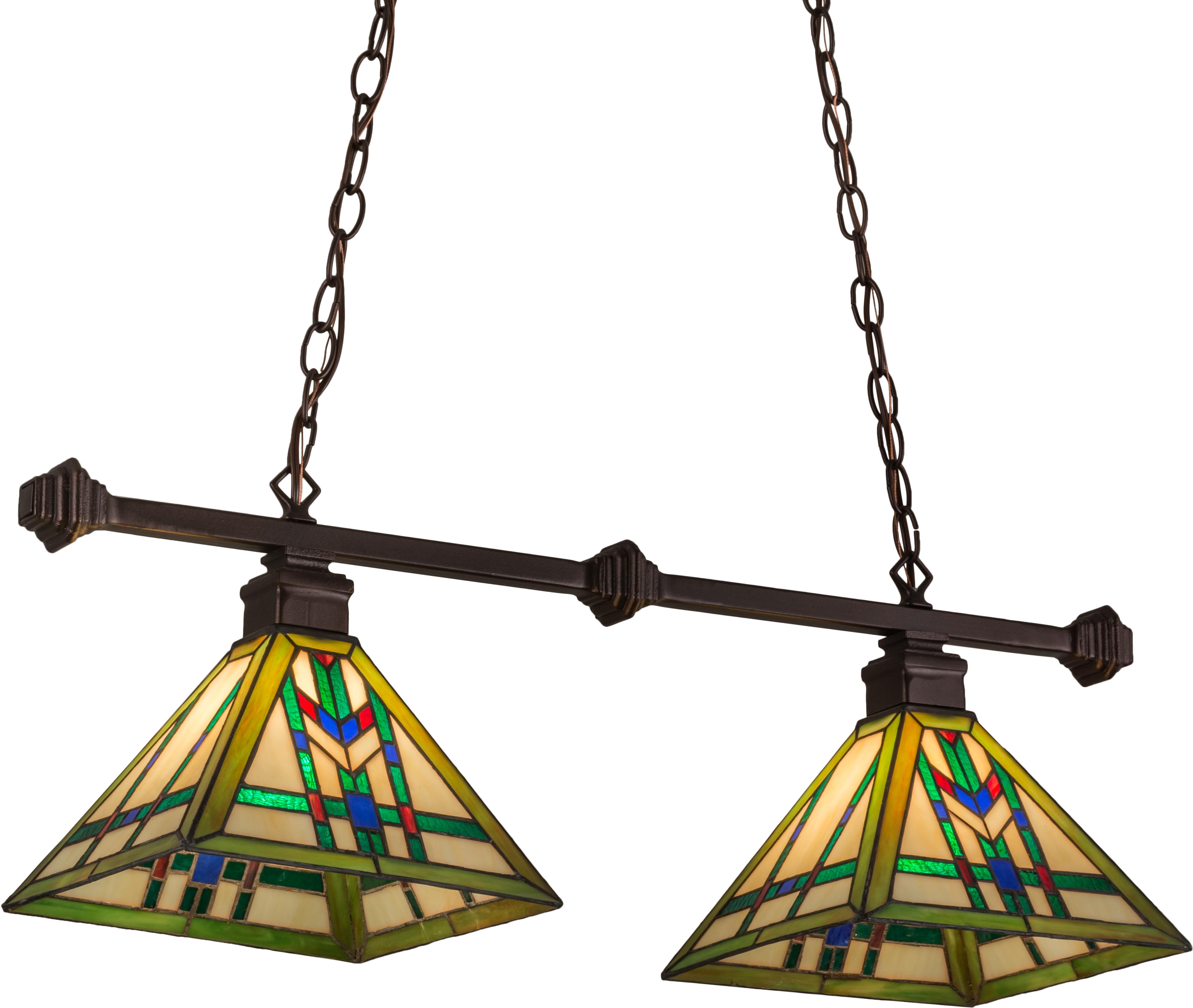 In the tradition of the Prairie School, organicobjects were interpreted into geometric forms. In thispendant, Meyda Tiffany uses colorful interlockingblocks of Green, Blue and Red glass to form stylizedwheat stalks on a Creamy Beige background. Thehandcrafted art glass shades are embraced by hardwarefinished in Mahogany Bronze. This pendant is perfectfor illuminating islands, counters, tables and otherrooms. Custom styles, colors, sizes and dimmablelamping options are available.