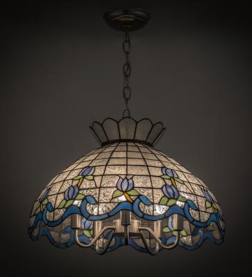 | Grace your home or business with this exquisite crownedshade, featuring a gridwork of Frost Etched art glass,which is adorned with a border of pale Sapphireswirling ribbons and perfect Ice Blue rosebuds. Theshade is crafted of hand cut art glass using MeydaTiffany's famous copperfoil construction process. Thependant is complemented with hardware featured in aNickel finish. Options include custom sizes, styles,colors and dimmable energy efficient lamping. Thisfixture is UL and cUL listed for damp and drylocations. Meyda Tiffany Pendant Bulb Type: CNDL Bulb Qty: 5 Bulb Wattage: 60 |