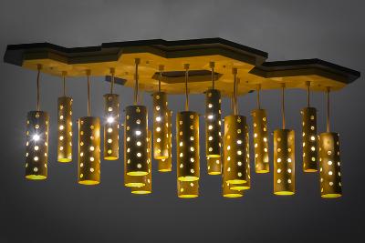 | Perforated voids in impressive Gold finished aluminumemit dramatic beams of brilliant ambient light. Likeshining stars overhead, a dazzling array of 20 customstyleed cylindrical pendants adheres to an impressivesteel canopy, depicted in a awe-inspiring geometricstyle with a look of fine wood. Handcrafted inAmerica, this ravishing fixture is offered in customoptions, which include an extensive color scheme of colors,finishes, sizes and dimmable energy efficient lamping.The fixture is UL and cUL listed for damp and drylocations. Meyda Tiffany Pendant Depth: 28.25 Bulb Type: INT Bulb Qty: 25 Bulb Wattage: 25 |