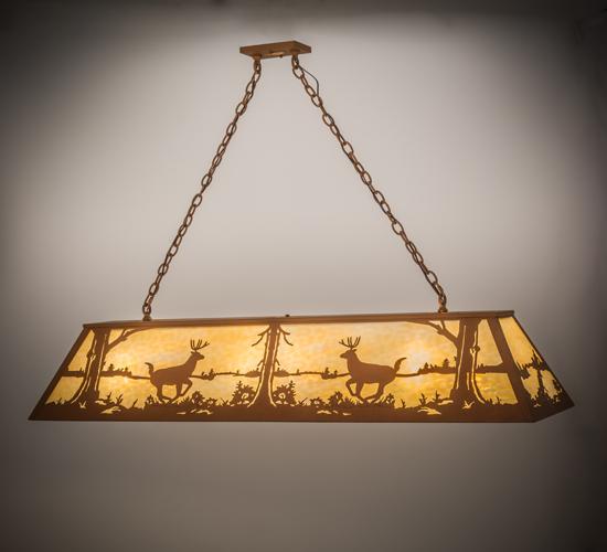 Two buck Deer leap by a lake in the woods on this nature inspired oblong pendant. The rustic fixture isfinished in Earth, has Beige glass panels, and ishandcrafted in the USA by Meyda artisans.