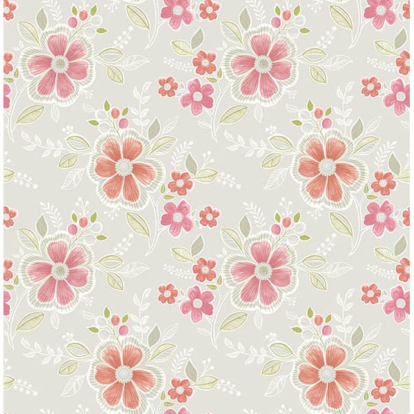 | Bright shades of pink rose, peach, and fern flow delightfully across a pale grey background that provides the perfect subtle contrast. Repeat: 10.43 Match: Straight Double Roll Width: 20.5 Roll Length: 16.5 Double Roll Coverage: 28 square feet Paste: Unpasted Material: Non-Woven Washability: Washable Strippable |